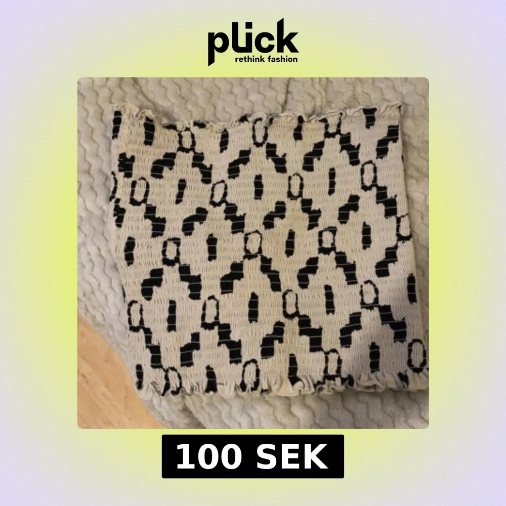 Säljer en beige topp med svart grafiskt mönster. Toppen har en smockad, elastisk struktur som ger en tight passform och volangkant upptill och nedtill. Perfekt för dig som gillar unika detaljer och vill sticka ut med ett coolt mönster.