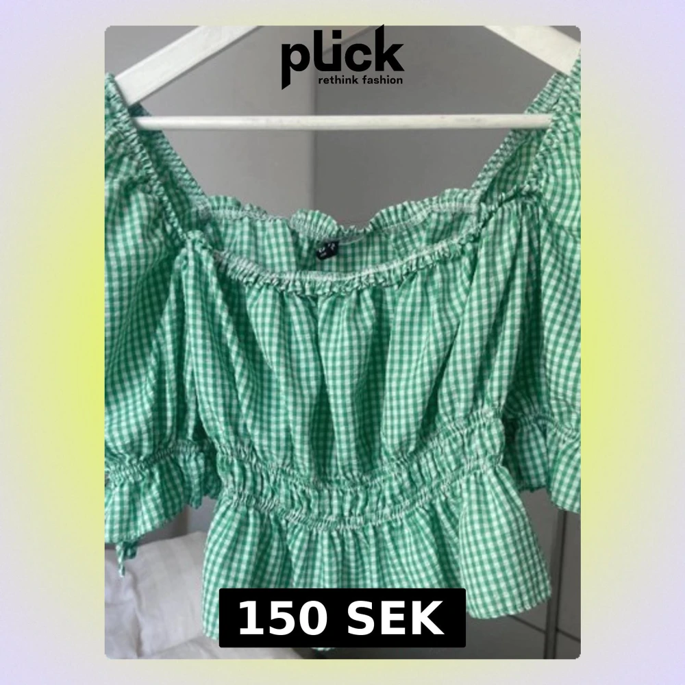 Säljer en söt grön och vit rutig blus från hm i storlek M. Blusen har offshoulder-design. Perfekt för vår och sommar.