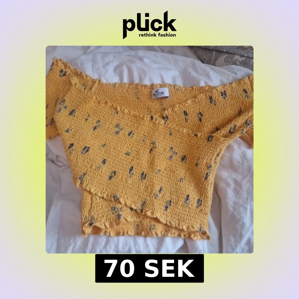 Superfin gul offshoulder topp från Hollister med små blå blommor och smockad struktur. Toppen har volangkant längs halsringningen och nederkanten, vilket ger en söt och somrig vibe. Perfekt till jeans eller kjol för en chill look.
