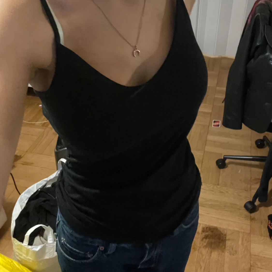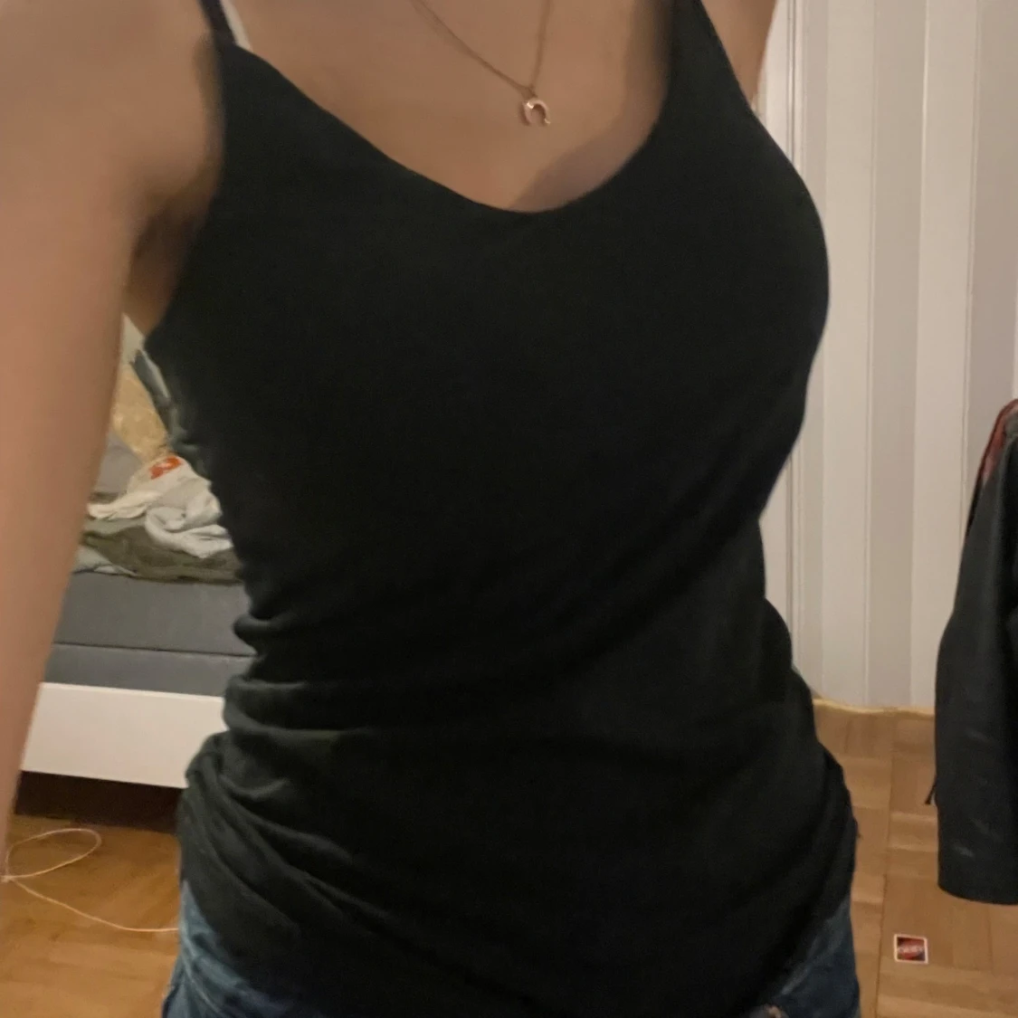 Snygg och enkel svart linnetopp med smala axelband. Perfekt för sommardagar eller som lager under en tröja. Toppen har en tight passform och är gjord i ett mjukt och bekvämt material.