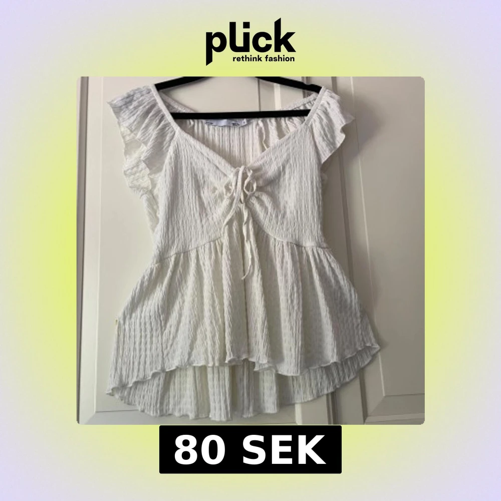 Supersöt vit volangblus från Lager 157 med volangärmar och liten knytning fram. Den har rynkad struktur och är lätt v-ringad. Jättefin till ett par jeans eller kjol💕Knappt använd.