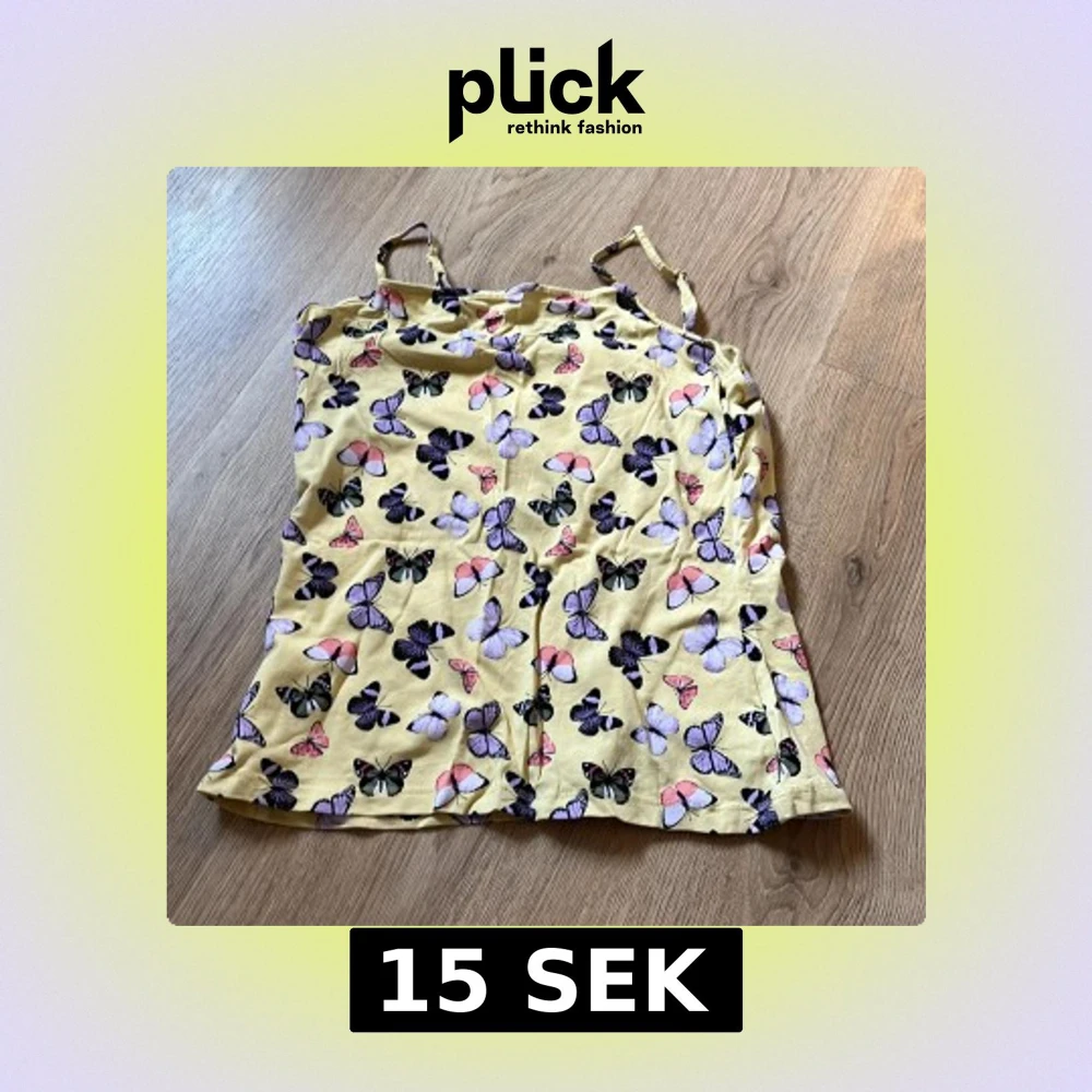 Säljer en söt gul linnetopp med tunna axelband och färgglada fjärilar i lila, rosa och svart över hela toppen. Perfekt för soliga dagar och har en lätt och skön känsla. Den är från Lindex men är köpt för länge sedan. Knappt använd så den är som ny. Storlek 170 men passar xs/s