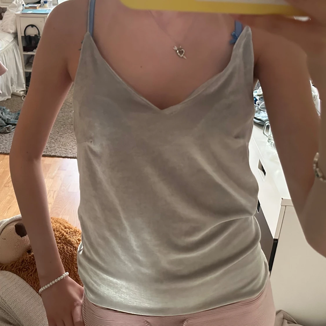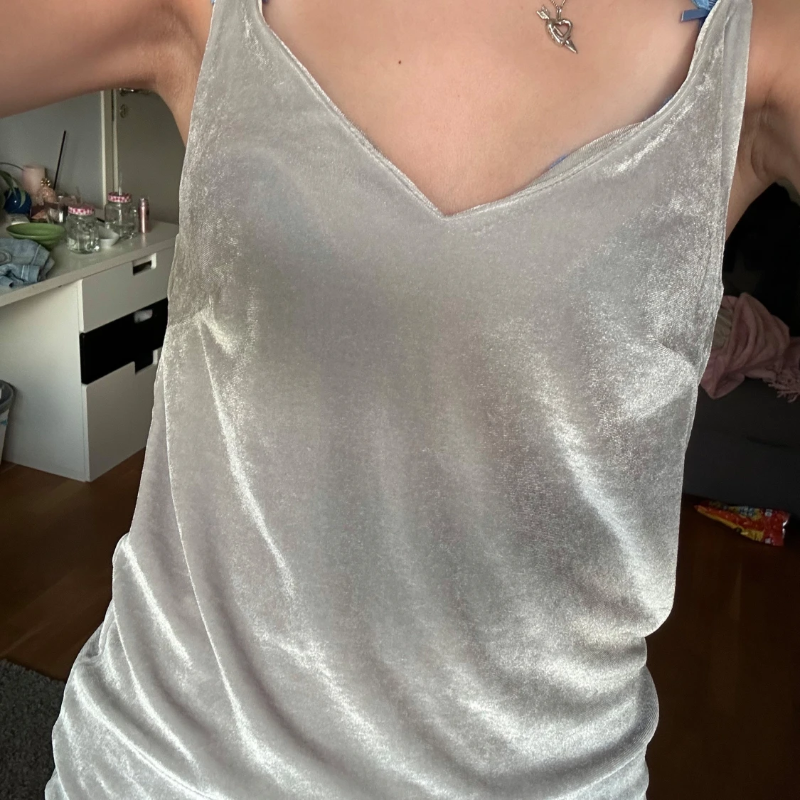 Säljer en ljusgrå sammets linnetopp med v-ringning och smala axelband. Man ser tyget bäst i sista bilden. Xs men passar S också