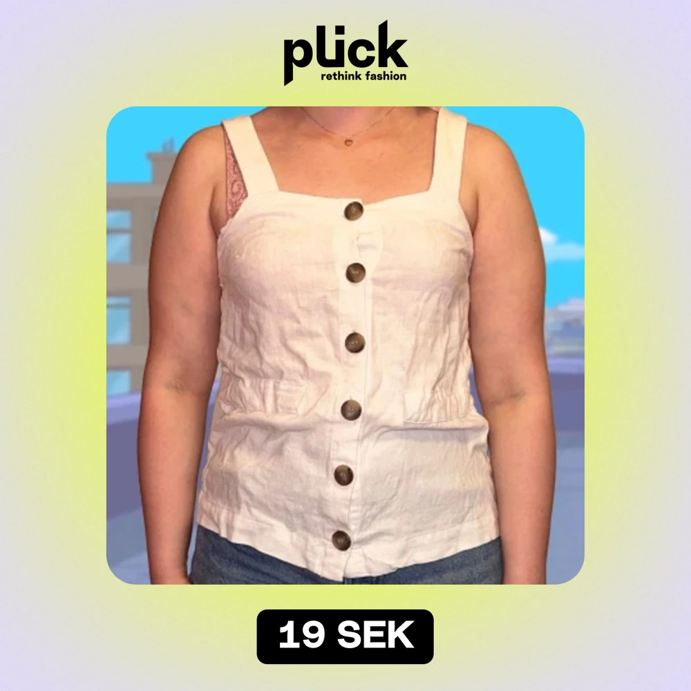 Enkel vit tröja med bruna knappar. Passar fint till sommaren men även annars också. Ger mig lite retrokänsla. Skulle säga att den är i storlek S, men storlekarna står på tredje bilden.
