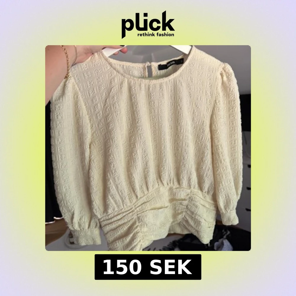 Supersöt vit/krämfärgad topp från BikBok med tight midja och trekvartsärm! Endast använd 1 gång så toppen är i väldigt fint skick 🩷Säljer då den inte passar mig längre.