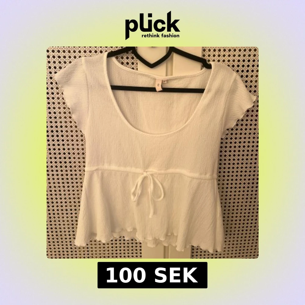 Supersöt vit topp från Nelly med ribbad struktur och volangkant. Storlek S. Använd ett fåtal gånger Den har korta ärmar, rundad halsringning och ett knytband i midjan som ger en extra gullig touch. Perfekt för dig som gillar en feminin och chill stil.