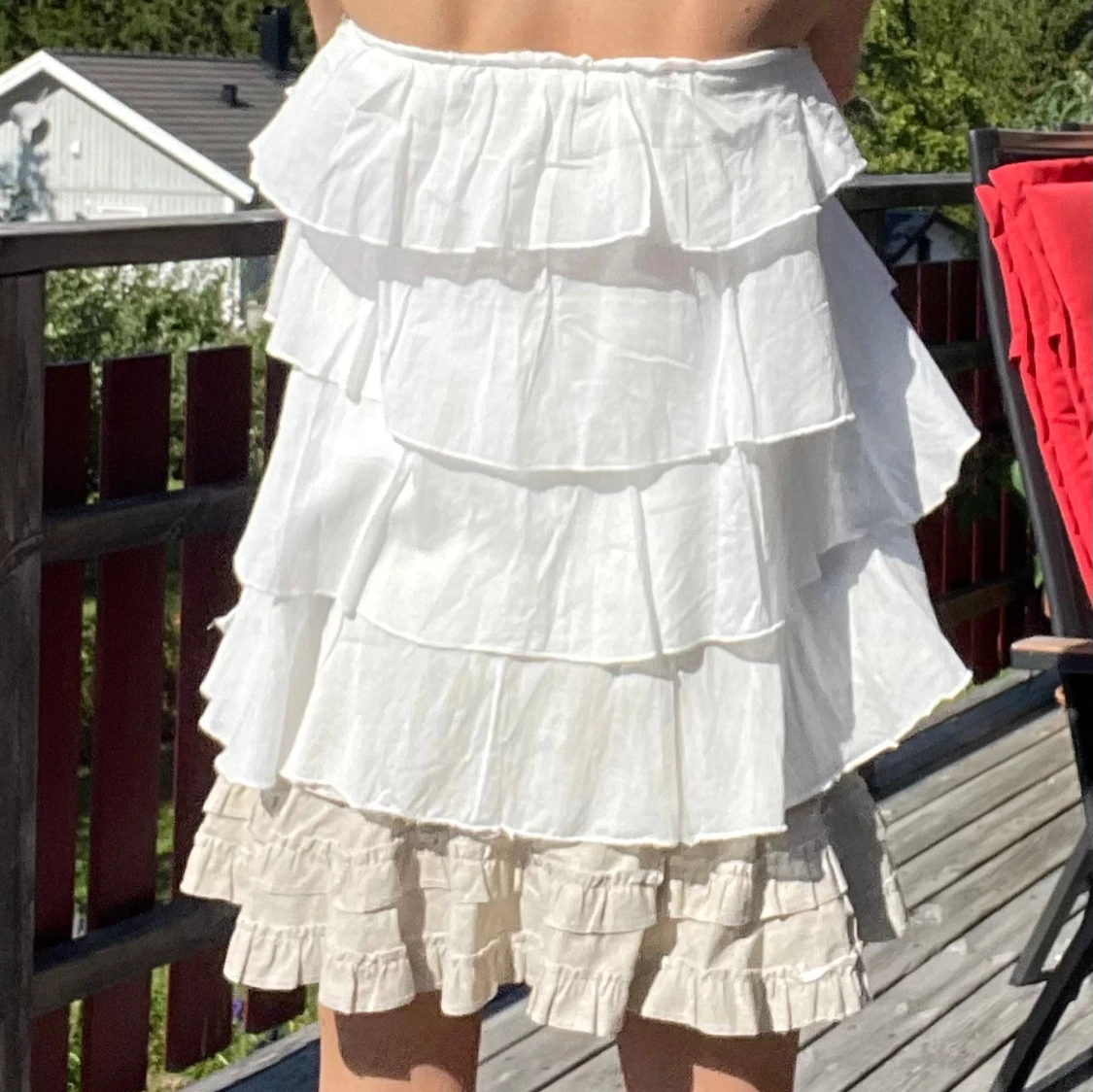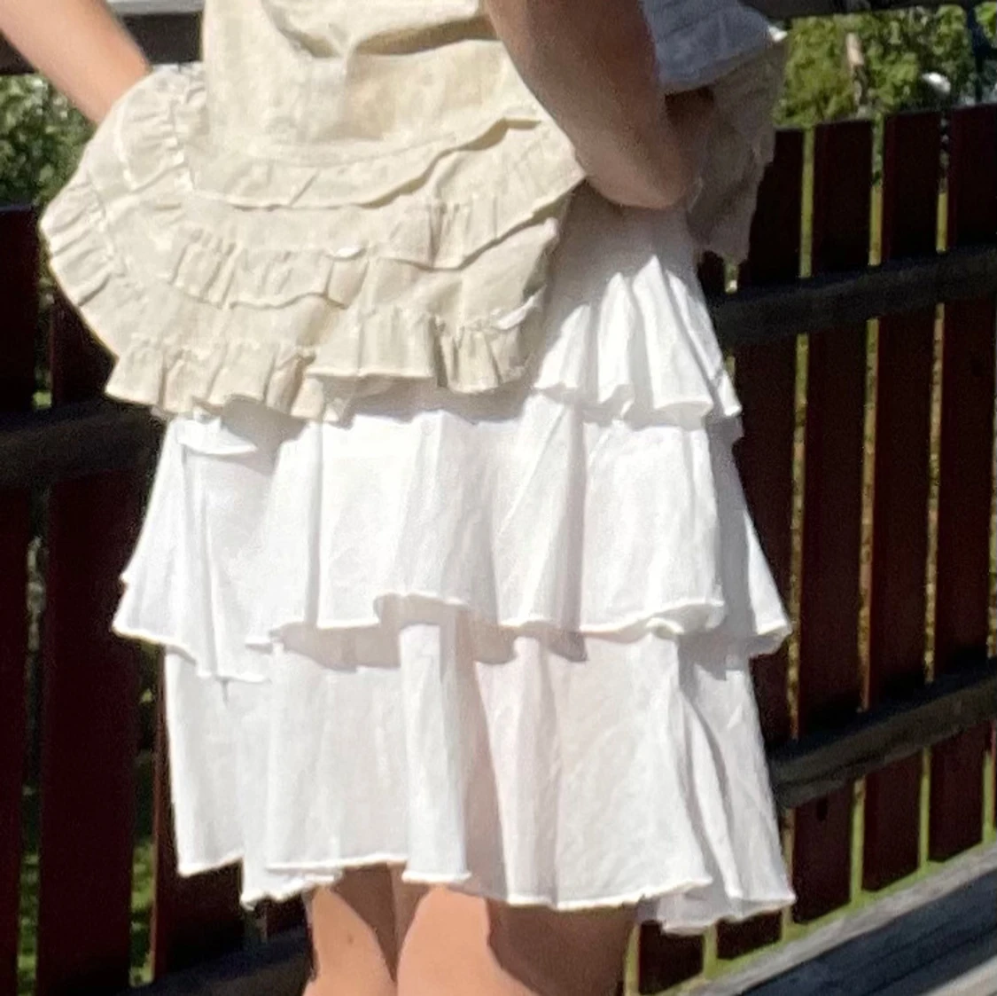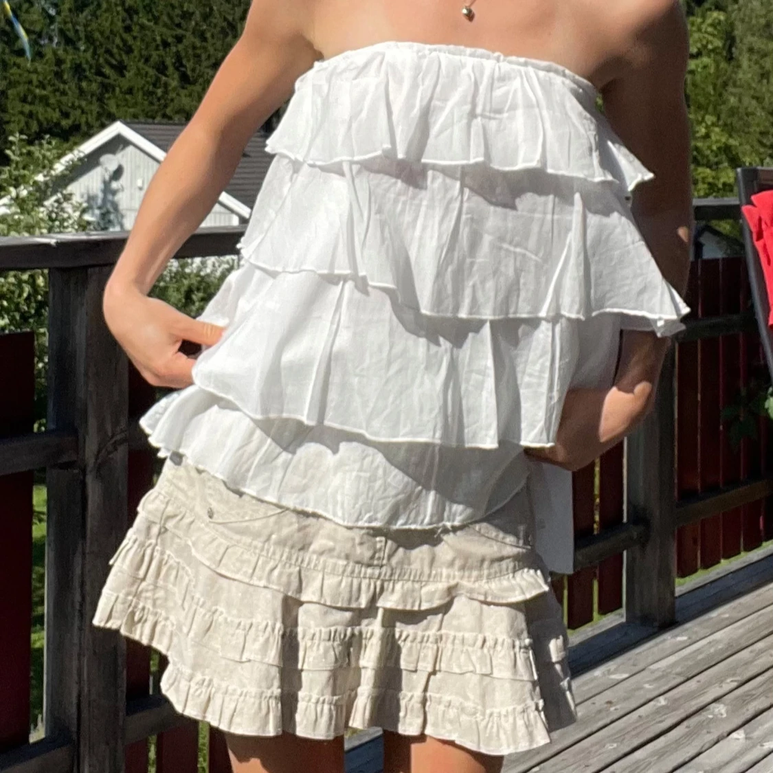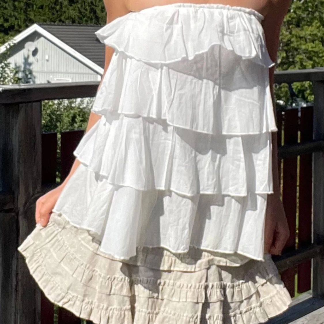 Supersöt vit bandeau tubtopp med flera lager volanger som ger en flowy och luftig känsla. Toppen är axelbandslös och har en lätt rynkad kant upptill för att sitta på plats. Perfekt för soliga dagar och sommarhäng. Står storlek 156/164 men skulle snarare säga xs-s! Går även att ha som kjol, likt att jag även säljer kjolen som går att ha som topp; två outfits i en!