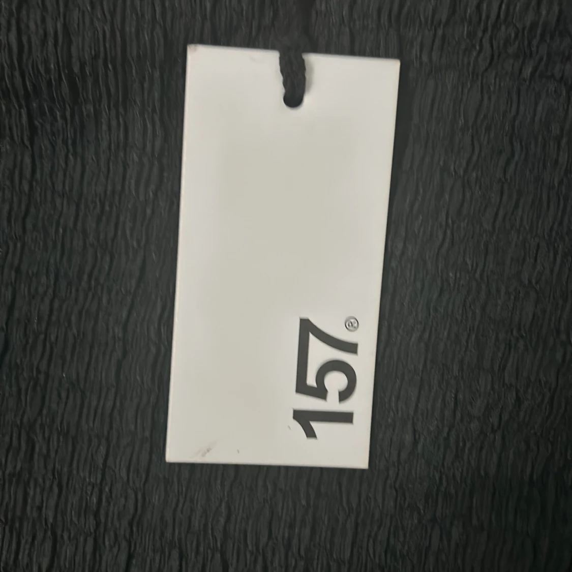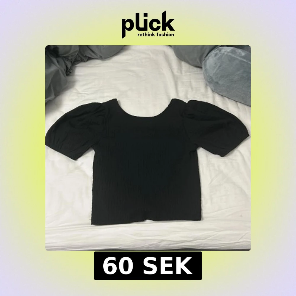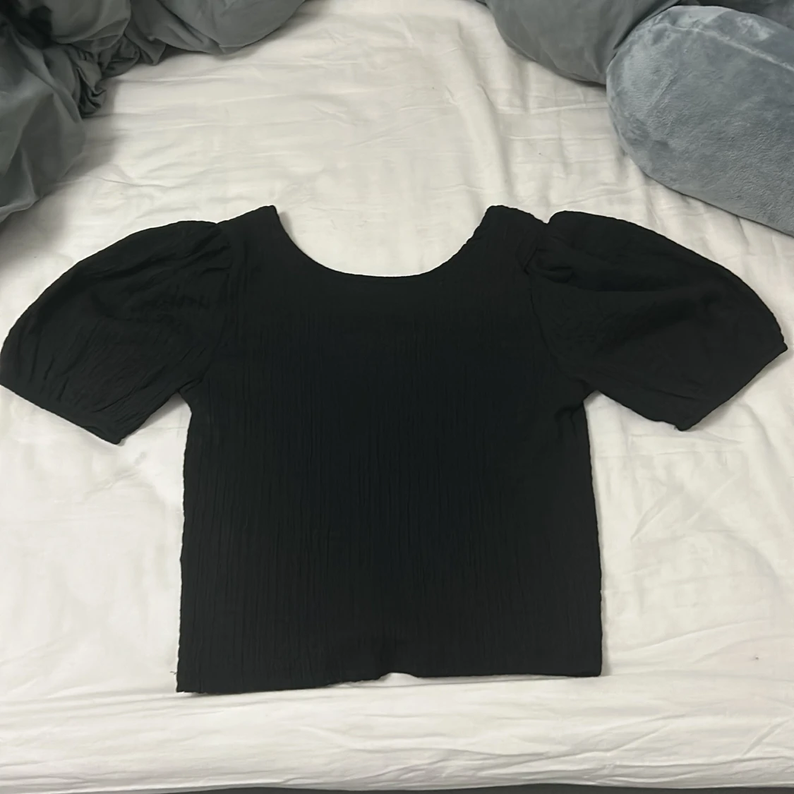 Snygg svart topp från 157 med puffiga kortärmar och en rund halsringning. Perfekt för en stilren look.