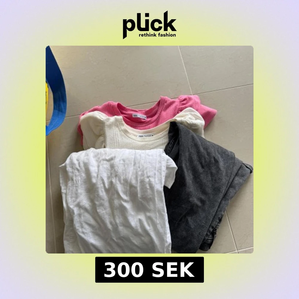 Ett klädpaket med blandade kläder Fint skick Storlek S Består av - 1 par grå svarta jeans - 1 linnebyxor från Gina Tricot - 2 tröjor med volanger