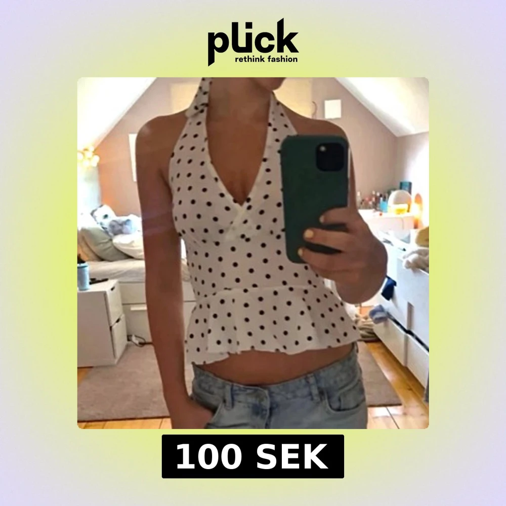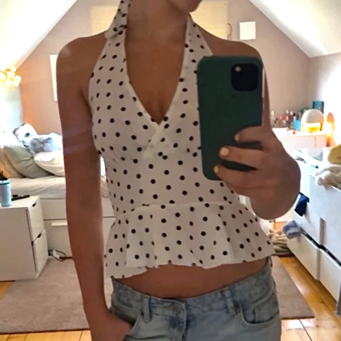 Säljer en vit topp med svarta prickar.