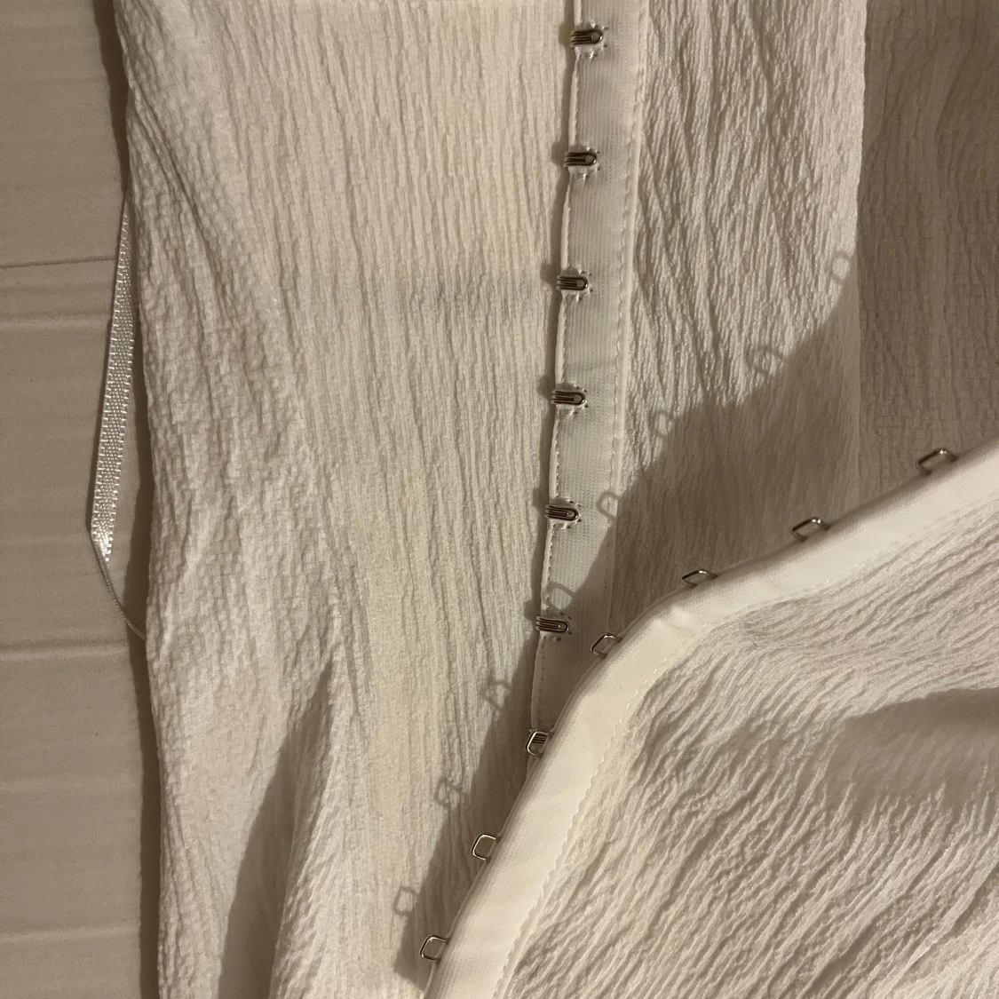 Säljer en snygg vit ribbad korsettopp med krokar framtill. Den är ärmlös och har en tight passform som framhäver figuren. Skit nice som fest topp, har använt den 1 gång och säljer pågrund av att den inte kommer till användning.