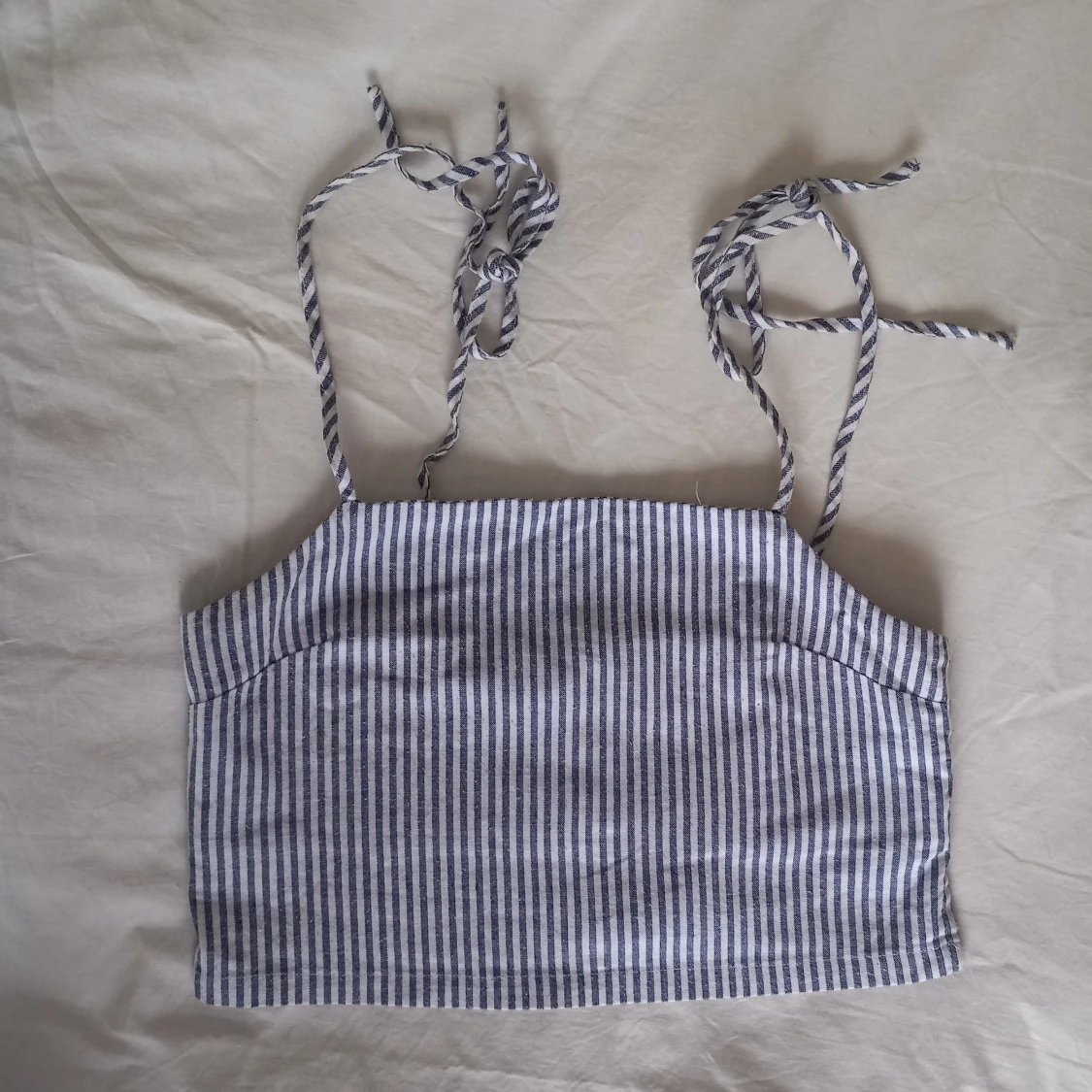 Blå/vit crop top modell med axelband som knyts. Passar xs-s