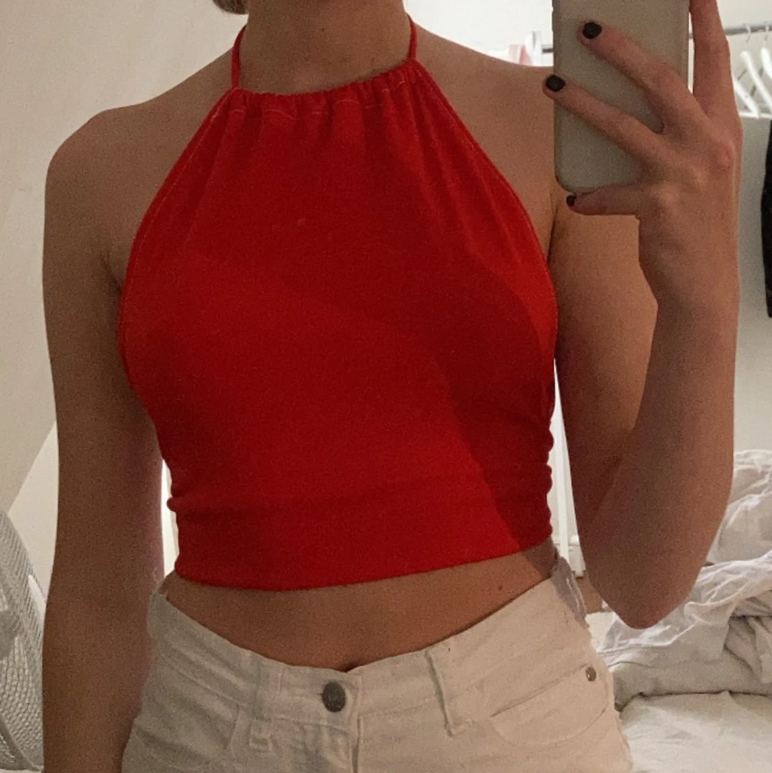 röd maskinsydd topp utav ett linne köpt second hand! inte genomskinligt!❤️👏🏻 passar XS/S/M bäst! (går att knyta som man vill ha den!)