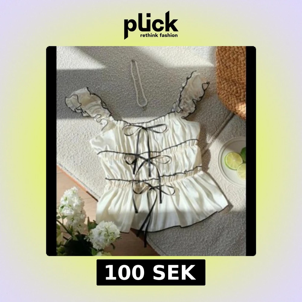 Supersöt vit linnetopp i satin med svarta volangkanter och tre svarta snörningar framtill. Axelbanden är volangprydda och toppen har en lätt glansig finish. Perfekt för dig som gillar romantisk och trendig stil. Aldrig använd!