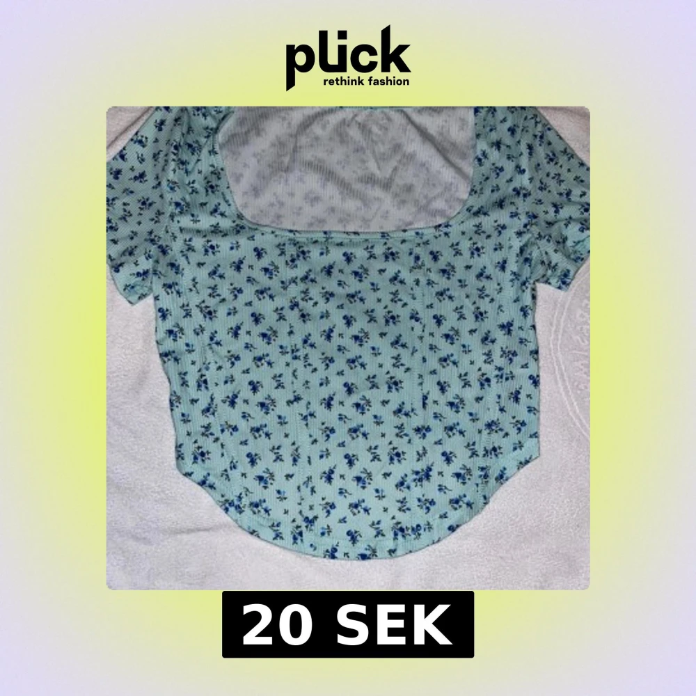 Superfin topp i mintgrönt med små blå blommor och diskreta ränder. Modellen har korta ärmar, rundad nederkant och fyrkantig urringning framtill. Perfekt för dig som gillar en söt och fräsch stil med blommigt mönster. Aldrig använd