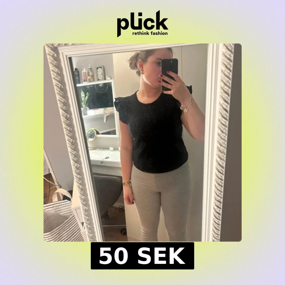Säljer en stilren svart topp med volangdetaljer vid ärmarna. Toppen har en rund halsringning och är kortärmad, perfekt för både vardag och festliga tillfällen.