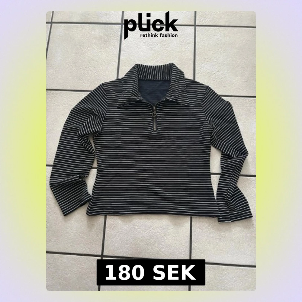 Snygg svart långärmad topp med vita tunna ränder och krage. Toppen har en halv dragkedja framtill med en liten ring som detalj. Perfekt till jeans eller kjol för en cool vardagslook.