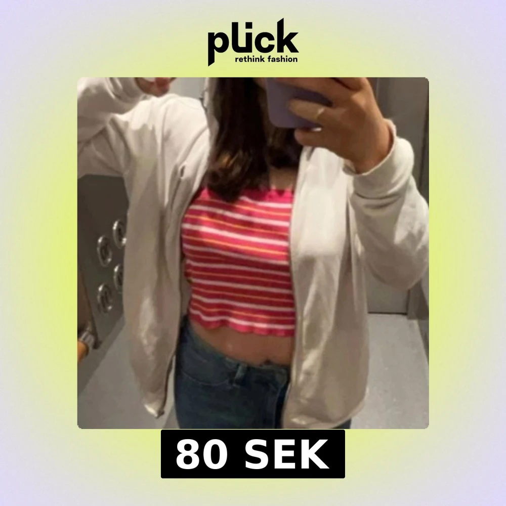 Säljer en färgglad croppad linnetopp med rosa och gula ränder. Toppen är ärmlös och har en vågig kant nedtill som ger en cool touch. Perfekt för varma dagar och att styla med jeans eller shorts.