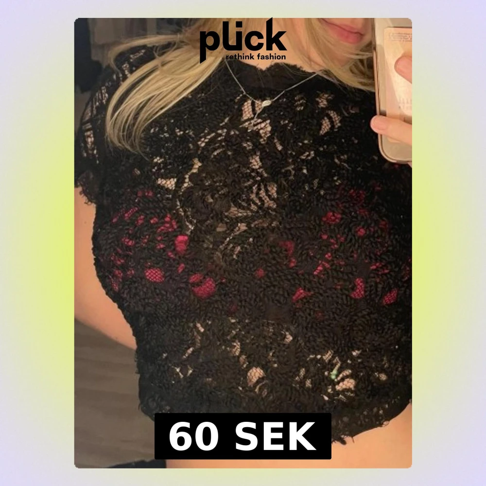 Säljer en svart croppad blus i spets med korta ärmar. Toppen har ett genombrutet mönster och är lätt transparent, vilket ger en edgy vibe. Perfekt att styla över ett linne eller bralette för en cool look. Dragkedja bak.