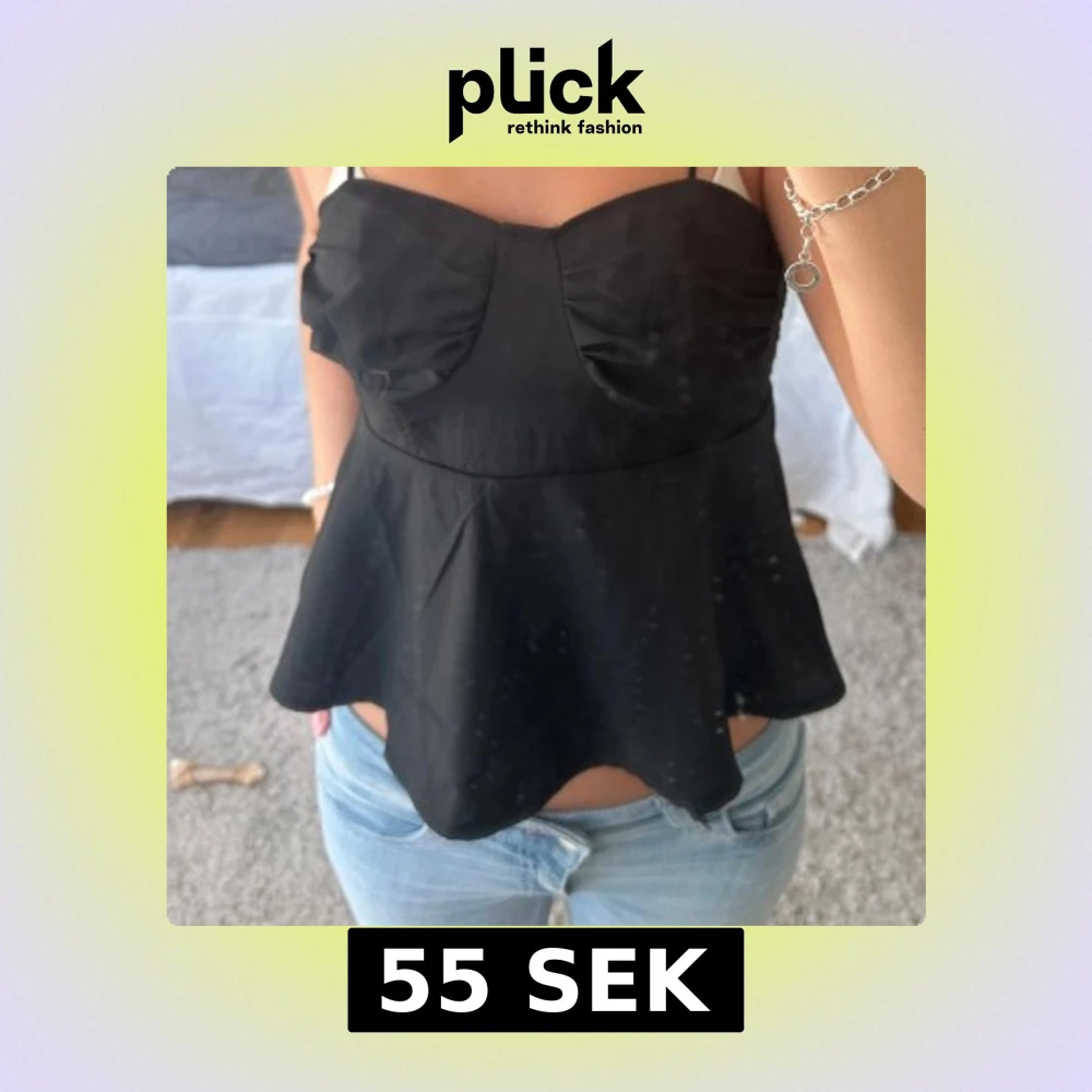 Säljer en svart topp med söt peplumform och smockad rygg. Toppen har tunna axelband som knyts i rosetter och en snygg sweetheart-urringning framtill. Perfekt att styla med jeans eller kjol för en trendig look.