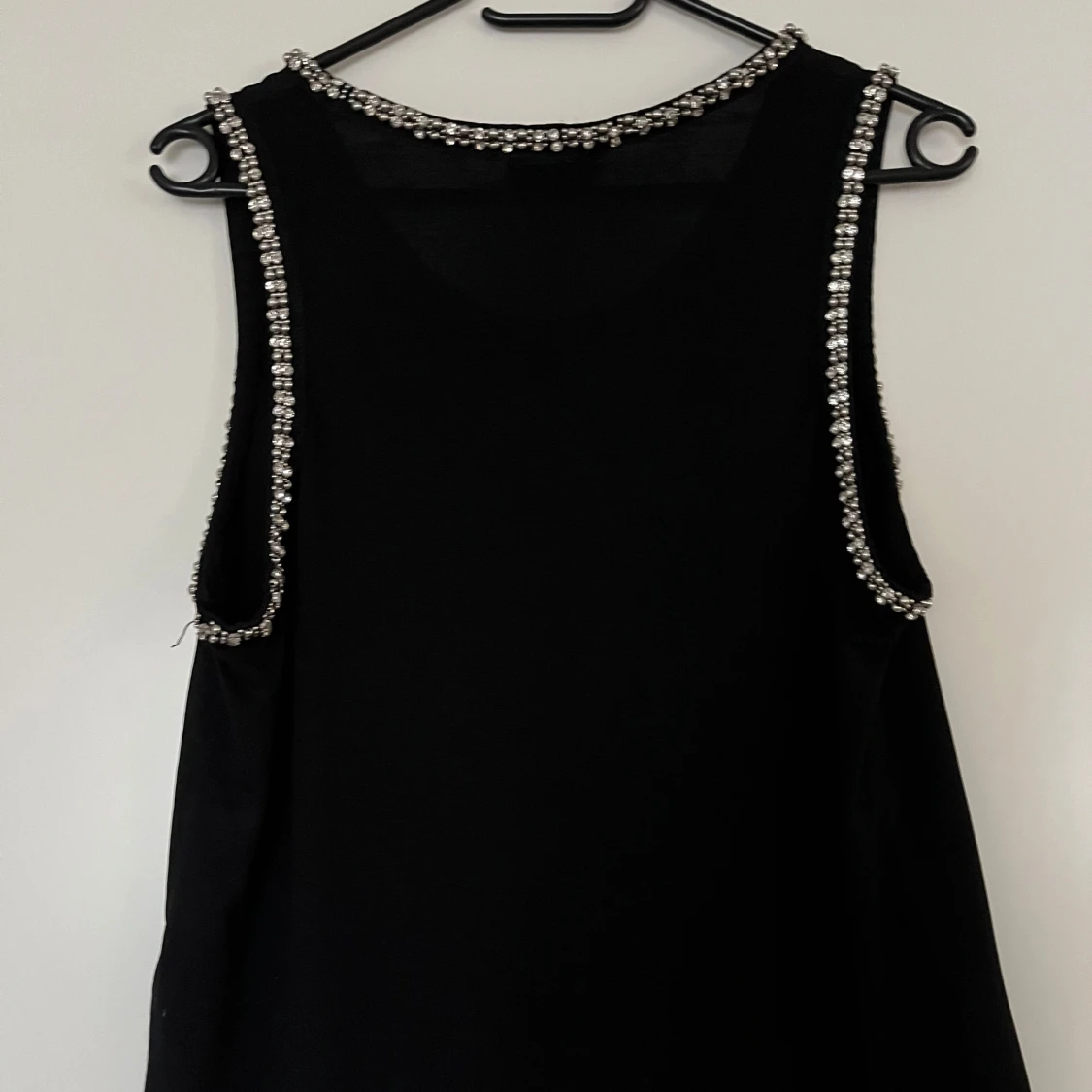 Svart topp med fina silvriga strassdetaljer från Top Shop i storlek M. I mycket fint skick. 100% viskos. Mått: Längd ca 55 cm Byst ca 50 cm Midja ca 50 cm