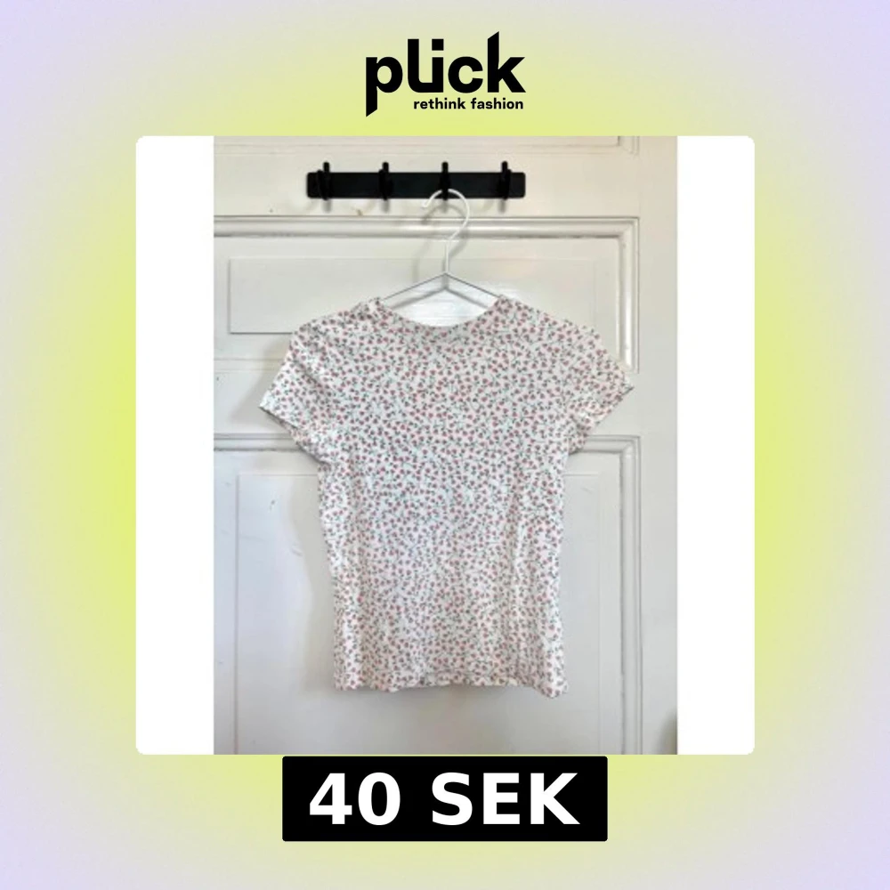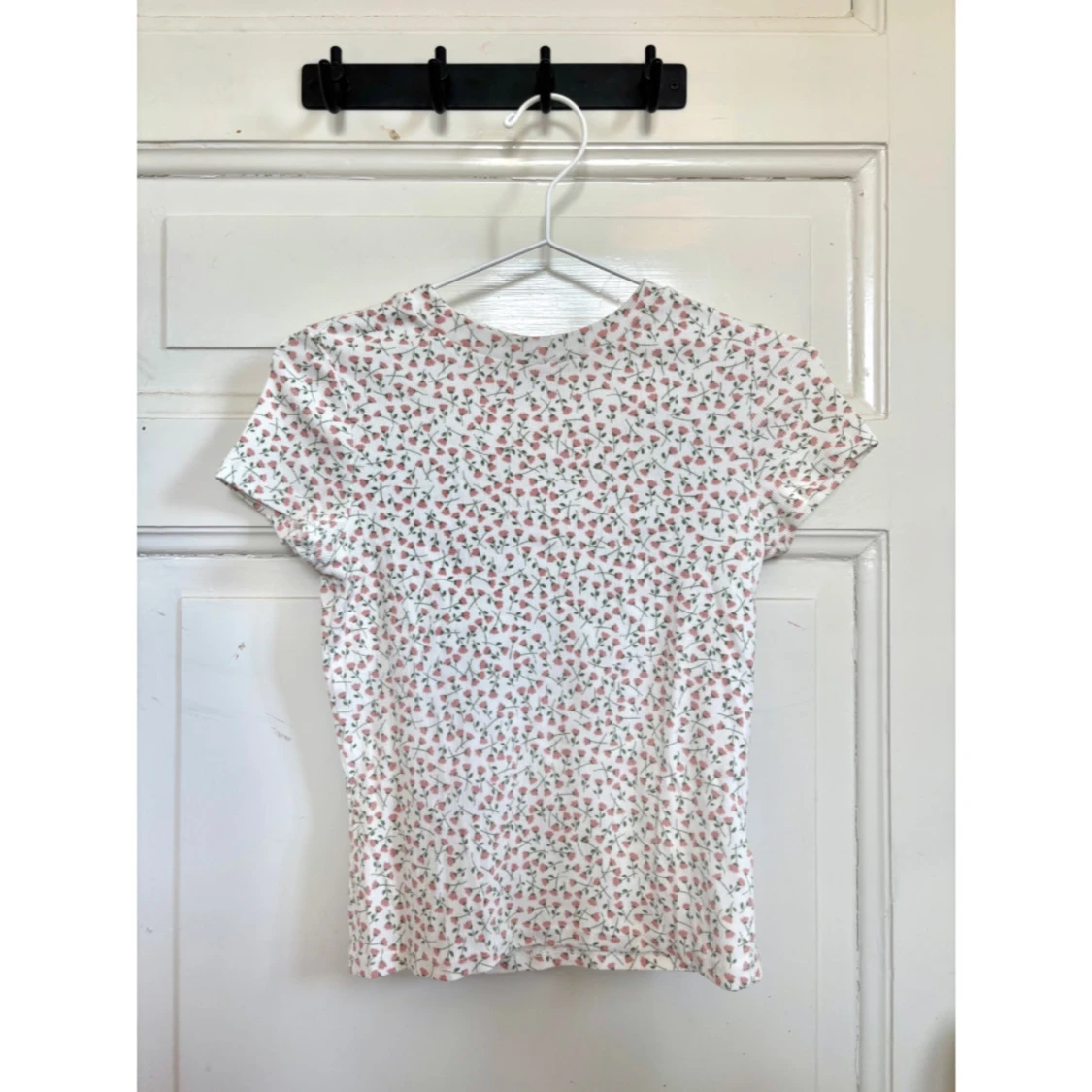 Söt vit t-shirt med små rosa blommor och gröna löv över hela tyget. ✨