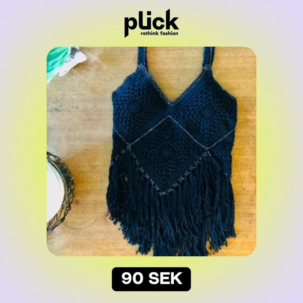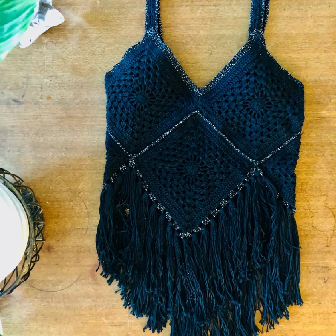 Säljer en superfin svart virkad topp med fransar. Perfekt för sommarens festivaler eller en dag på stranden. Passar perfekt till shorts eller en kjol för en bohemisk look.