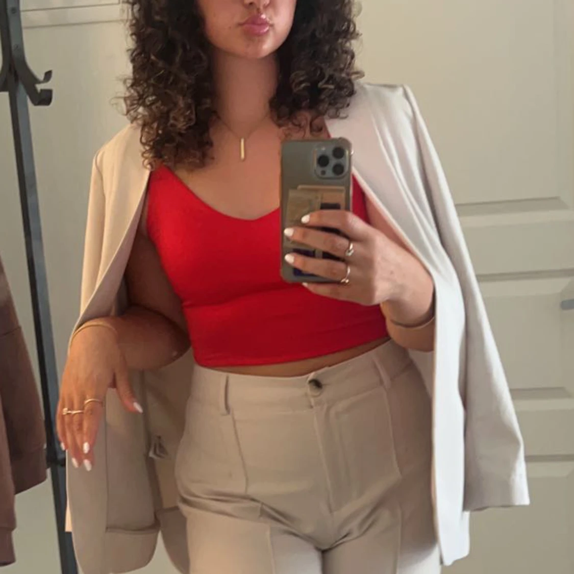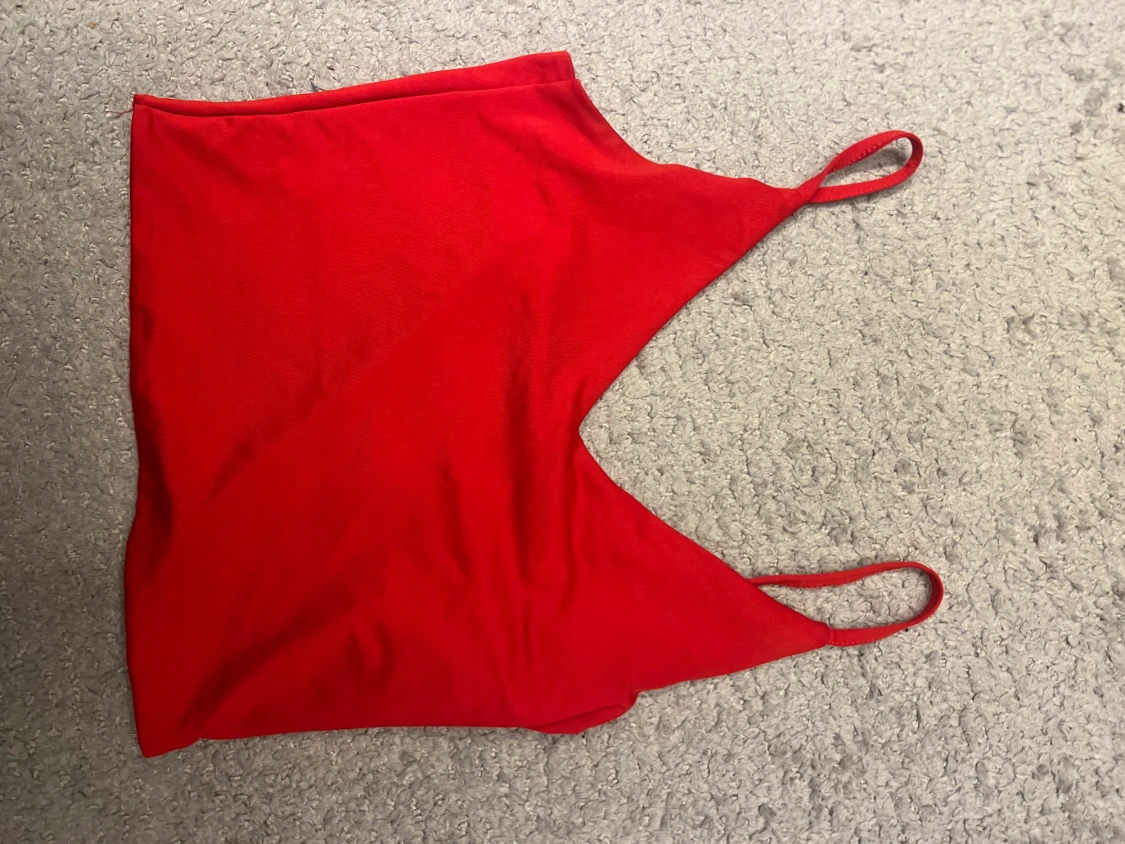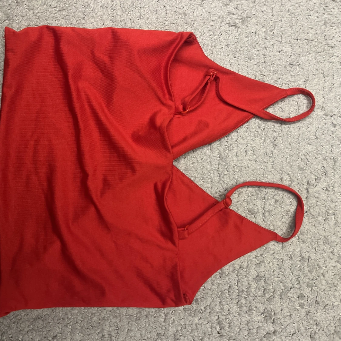 En jättefin v ringad röd topp så sitter bra på kroppen och funkar till allt Storlek M