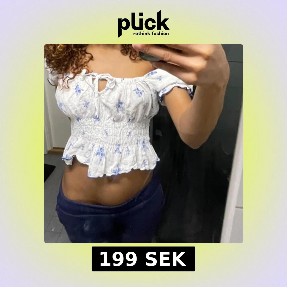 Söt vit offshoulder topp med blå blommor och volangdetaljer. Toppen är croppad och har en smockad midja för en bekväm passform. Perfekt för varma dagar!