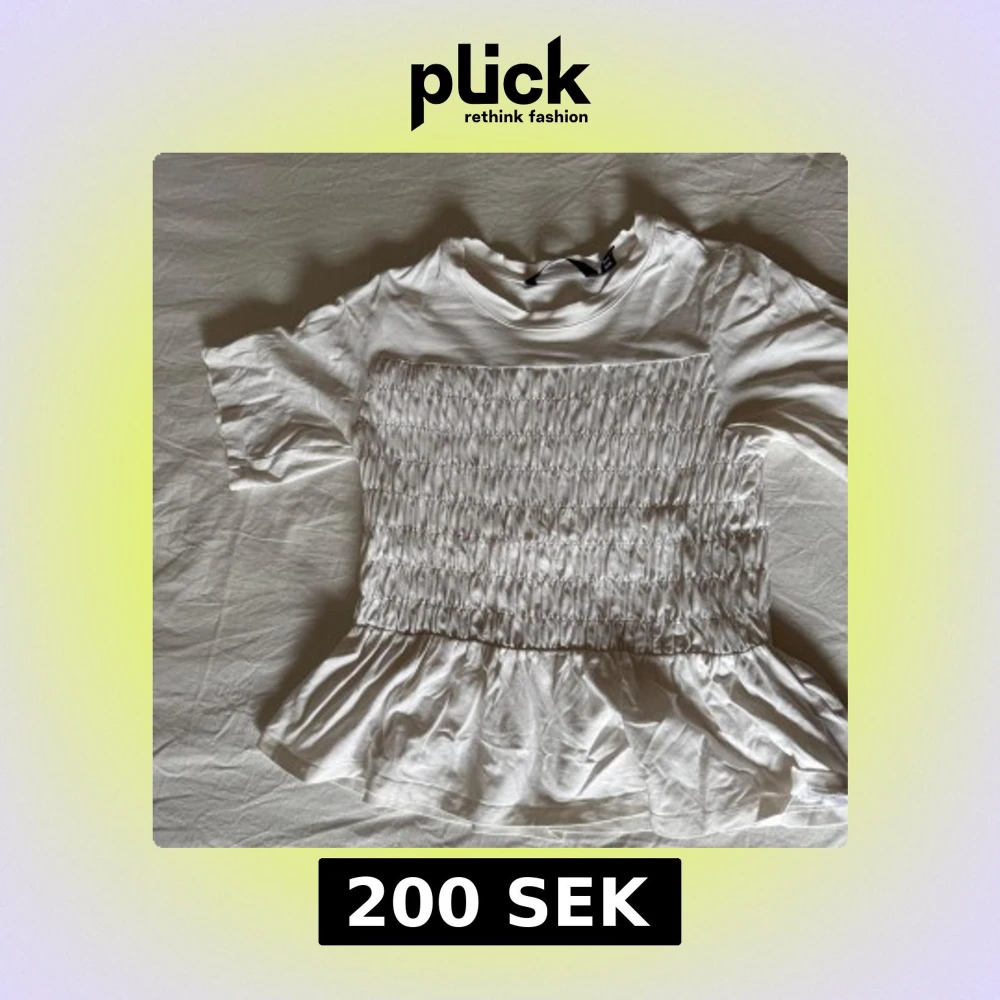Säljer en söt vit topp med smockad front och rygg samt volang nertill. Toppen har rund halsringning och korta ärmar. Perfekt för en fräsch och somrig look!