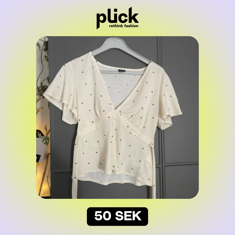 Svart prickig bikiniöverdel med volang - Säljer en svart bikiniöverdel med vita prickar och dekorativ vit volang längs kanterna. Modellen har knyt både i nacken och ryggen för justerbar passform. Perfekt för strandhäng och poolparty! OBS NOTERA ATT JAG SÄLJER ENDAST BIKINIÖVERDELEN.