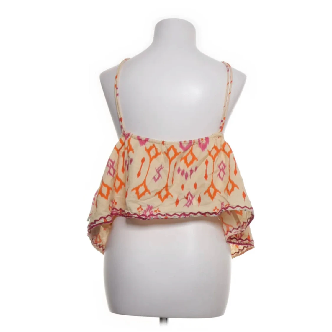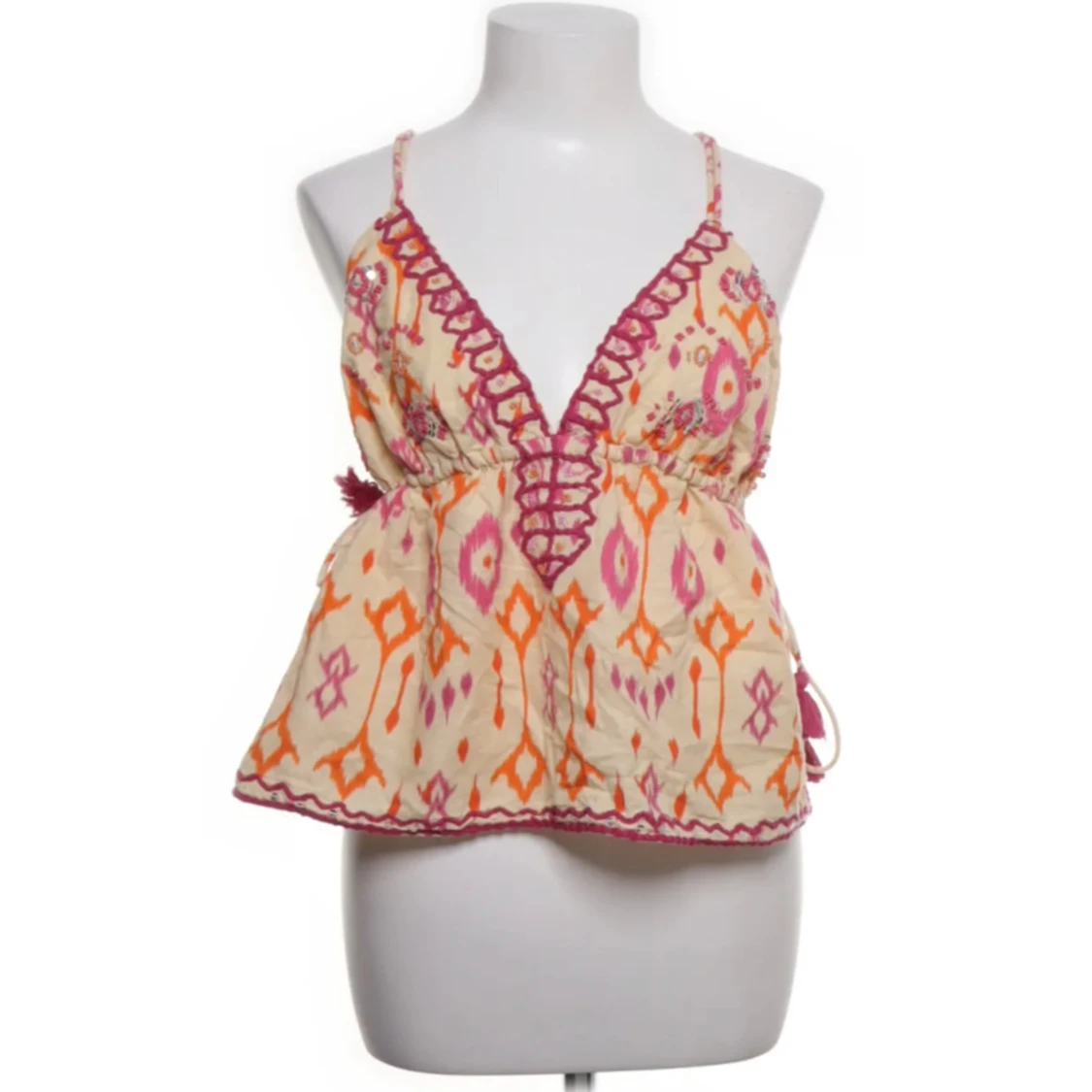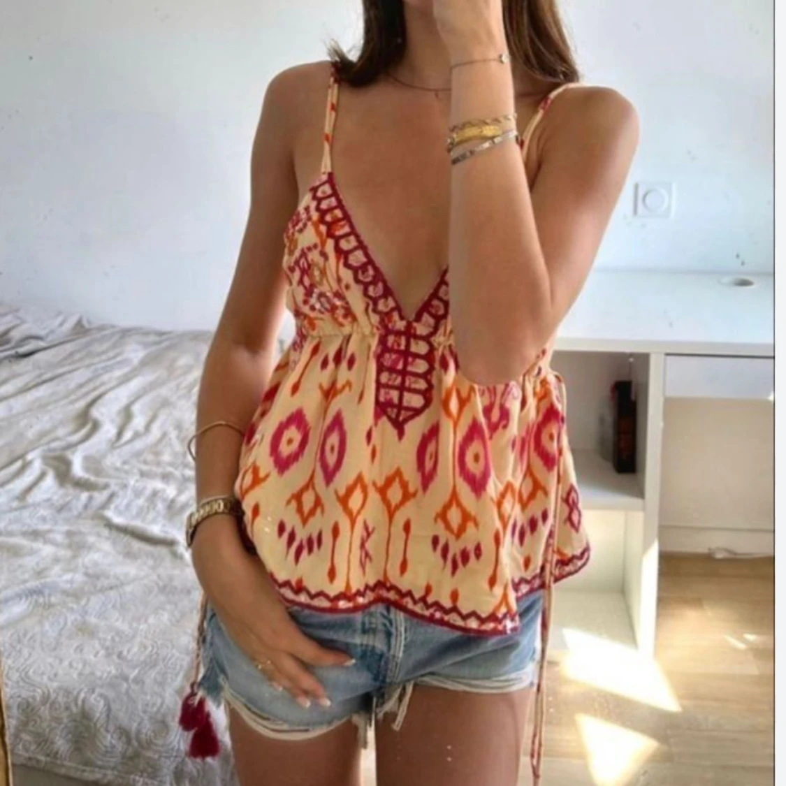 Säljer en så gullig topp från Zara, linnetopp med smala axelband och v-ringning. Toppen är beige med färgglada mönster i rosa, orange och lila, samt dekorativ snörning framtill och broderade detaljer. Materialet är lätt och luftigt, perfekt för varma dagar. Aldrig använd! Men lappen tyvärr ej med.