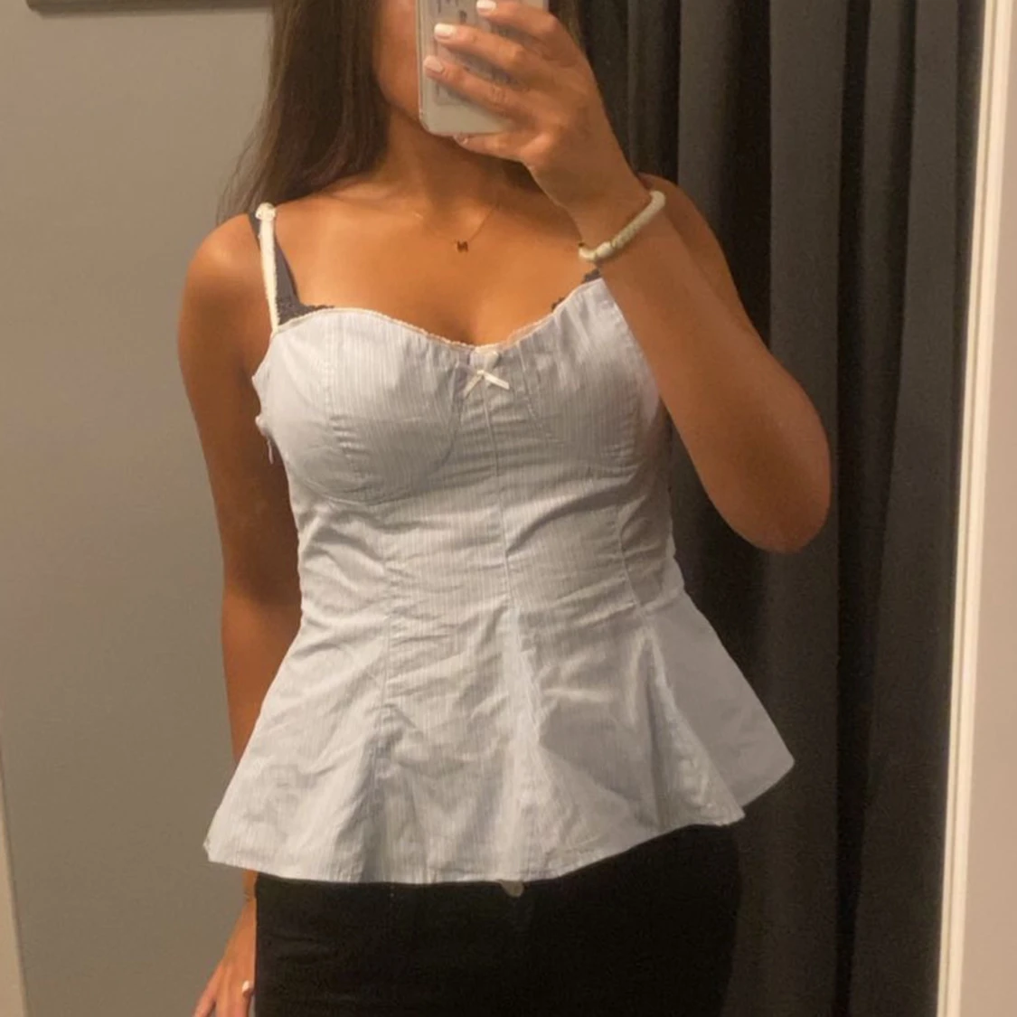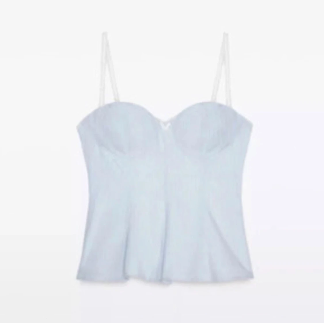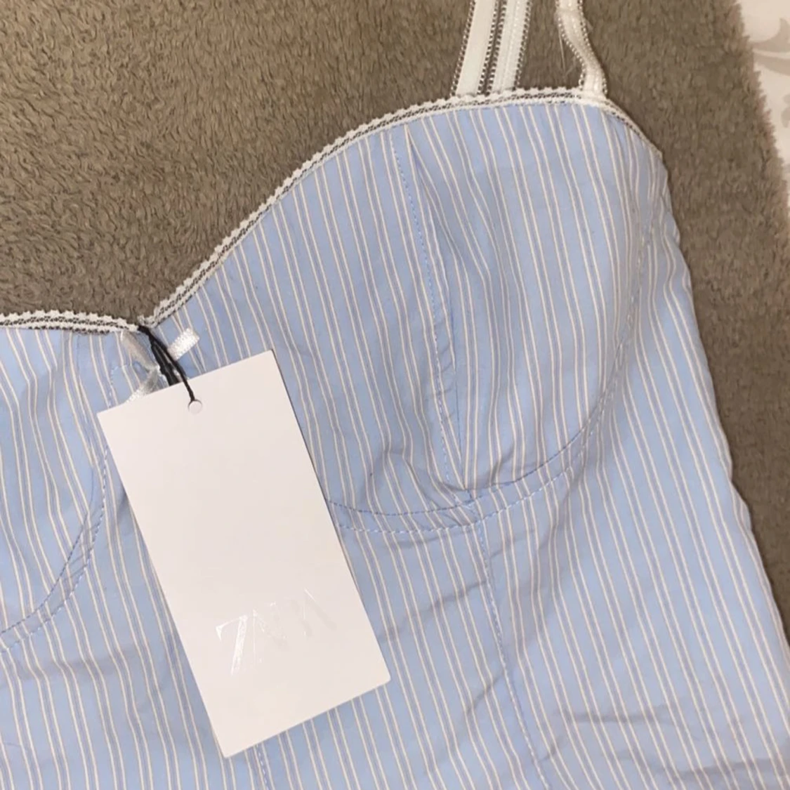 Supersöt korsett aktig topp från zara i nyskick med prislapp kvar. Den är blå vit randig med en rosett och vita spets detaljer. I storlek M