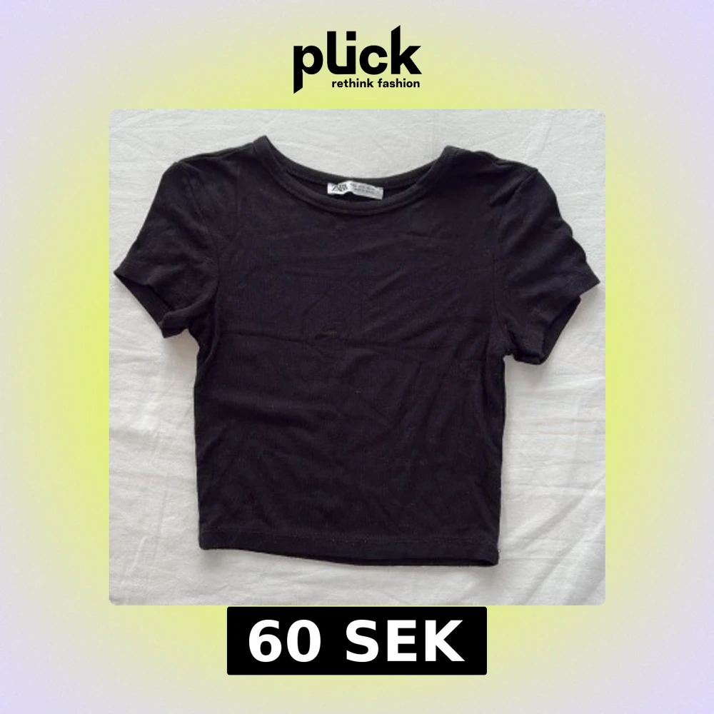 En svart, enkel och croppad topp från Zara med rund halsringning och korta ärmar. Perfekt att matcha med höga jeans eller kjol för en clean look. Tillverkad i mjuk bomull som känns skön mot huden.