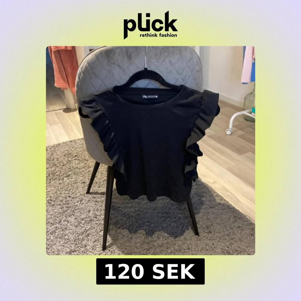 Säljer en snygg svart topp från Zara med volangdetaljer längs ärmarna. Perfekt för att ge en extra touch till din outfit. Toppen har en rund halsringning och är tillverkad i ett mjukt material.💓