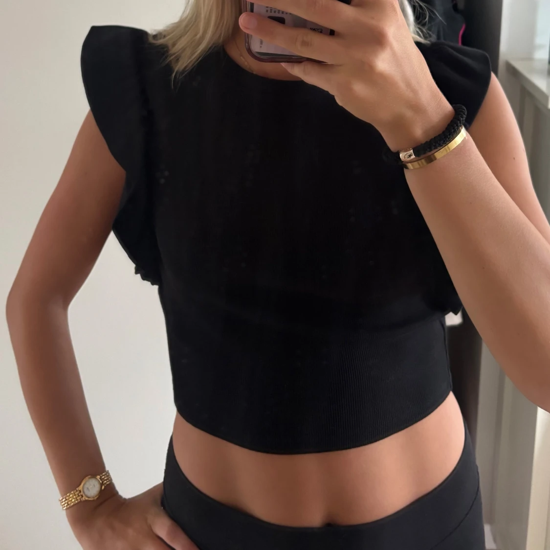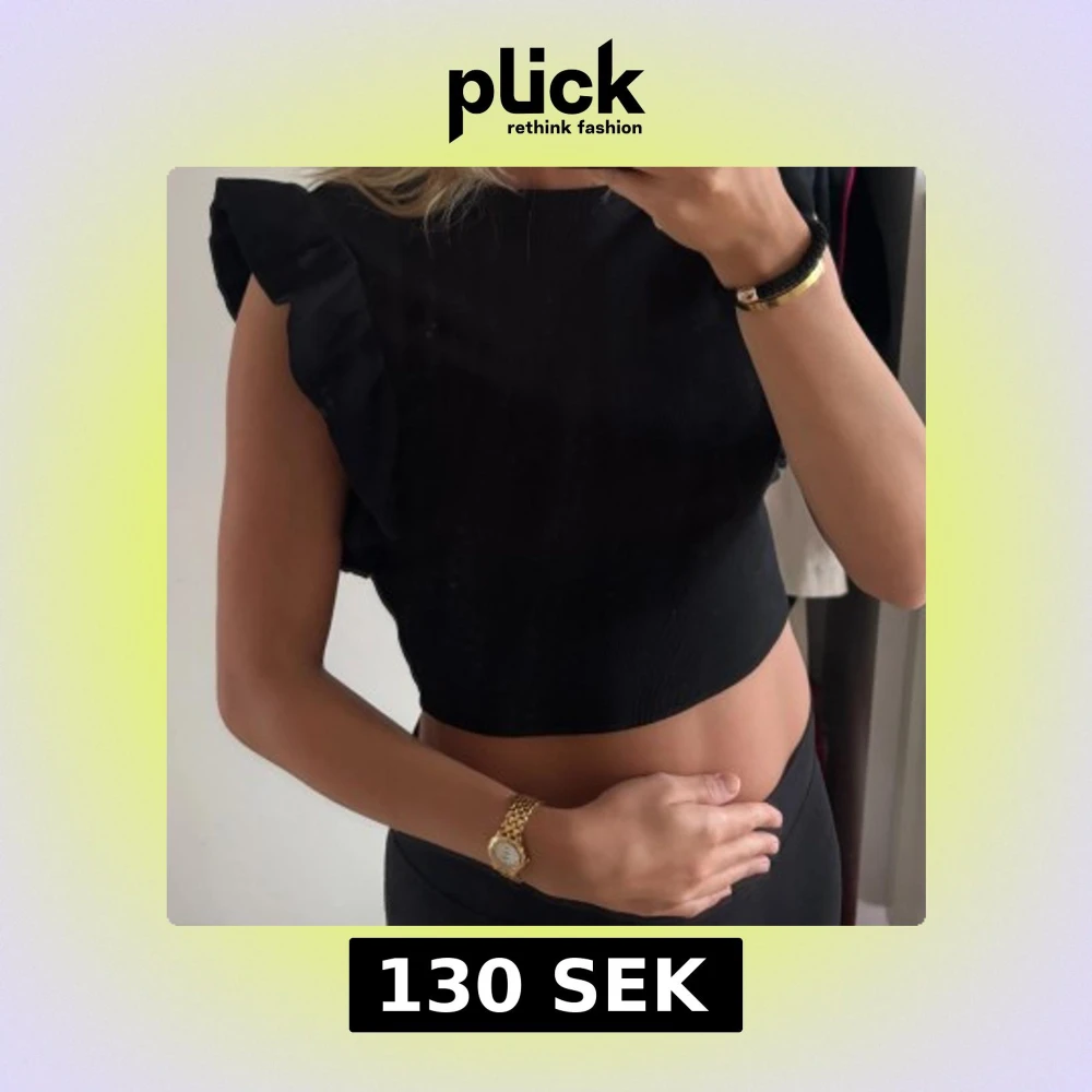 Svart ribbad topp från Zara med volangdetaljer på axlarna. Knappt använd!