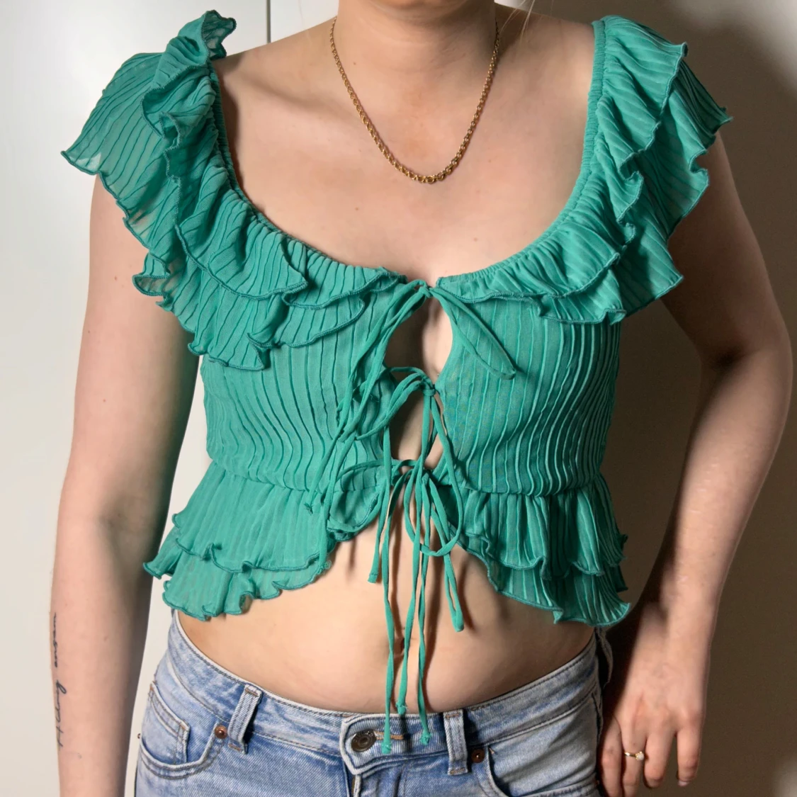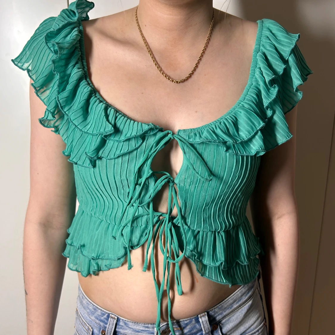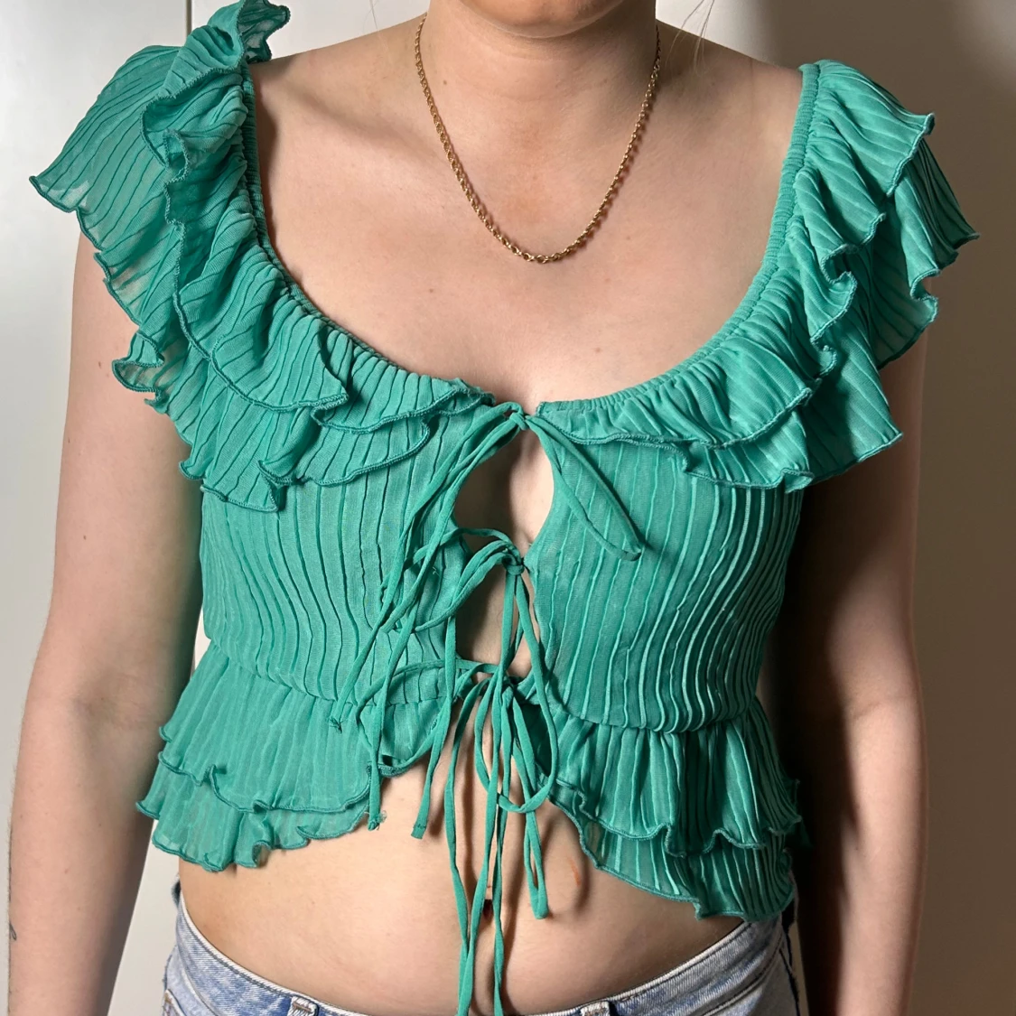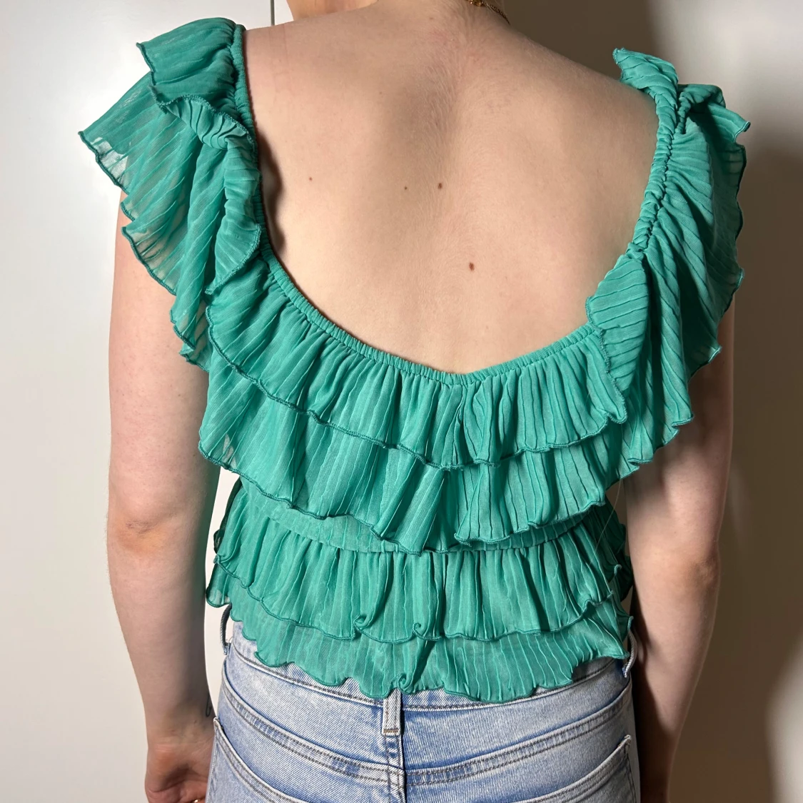 Superfin turkos volangtopp från Zara. Knappt använd så i jättefint skick. Köp sker via köp nu, jag postar inom 24h. Kvar tills markerad såld