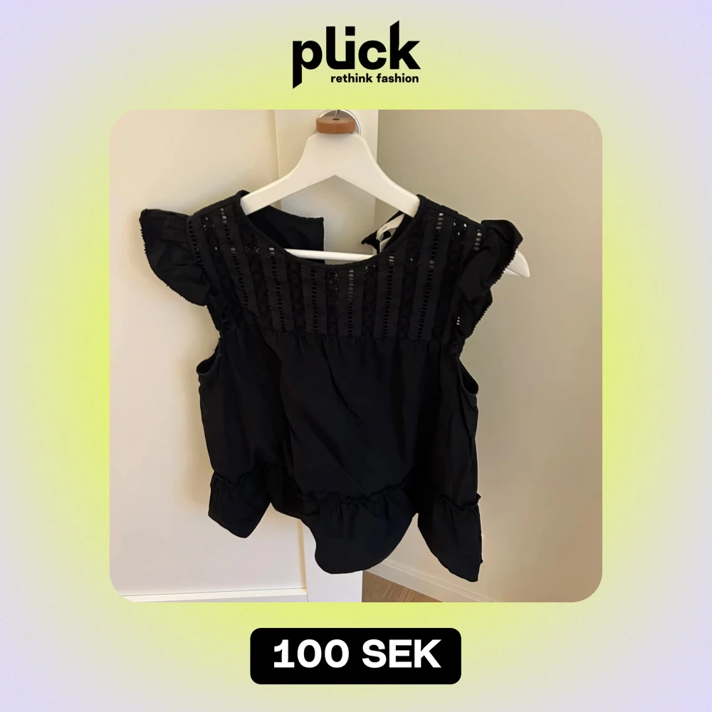 Säljer en söt svart blus med volangdetaljer på ärmarna och nederkanten. Blusen har en fin struktur upptill och är perfekt för både vardag och fest. Den är i bra skick och passar till många olika outfits.