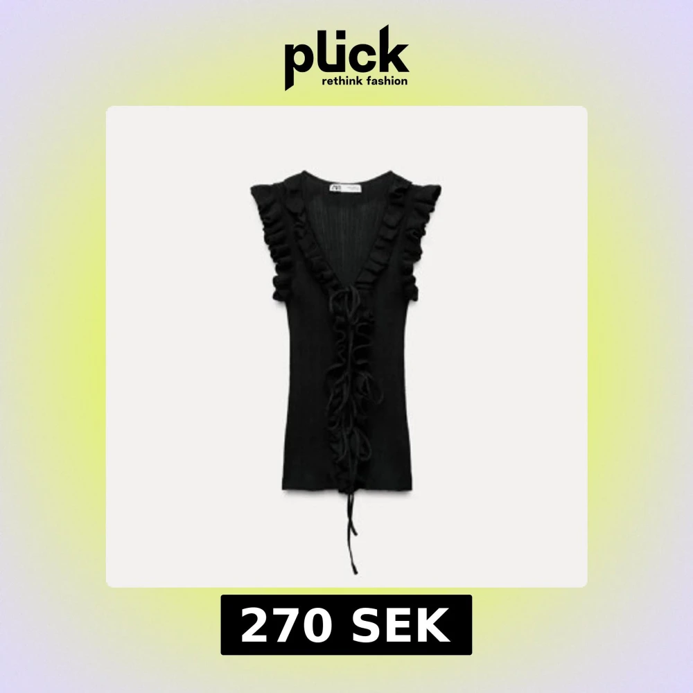 Svart ribbad topp från Zara med djup v-ringning, volangdetaljer längs axlar och fram, samt snörning framtill. Ärmlös design som ger en edgy och trendig vibe. Perfekt att styla med jeans eller kjol för en cool look.