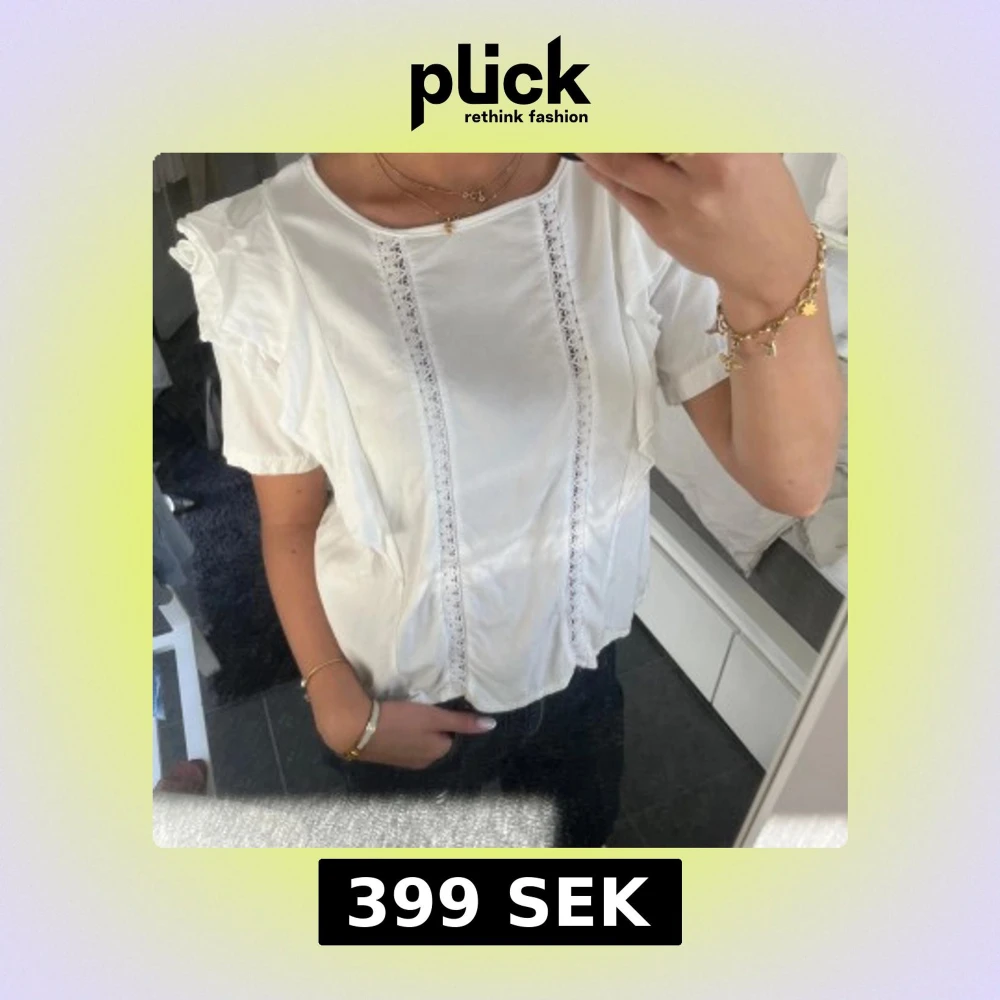 Säljer en söt vit blus med spetsdetaljer framtill. Blusen har korta ärmar med volang och en rund halsringning. Perfekt för vår och sommar 💞