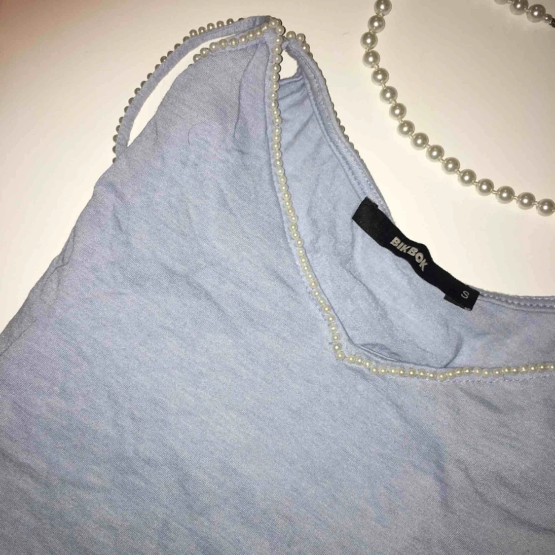 Ett babyblått linne från Bikbok med pärldetaljer! Storlek S! Köparen står för frakten, men kan även mötas upp i Kalmar 🐳🦋❄️🌊🐚