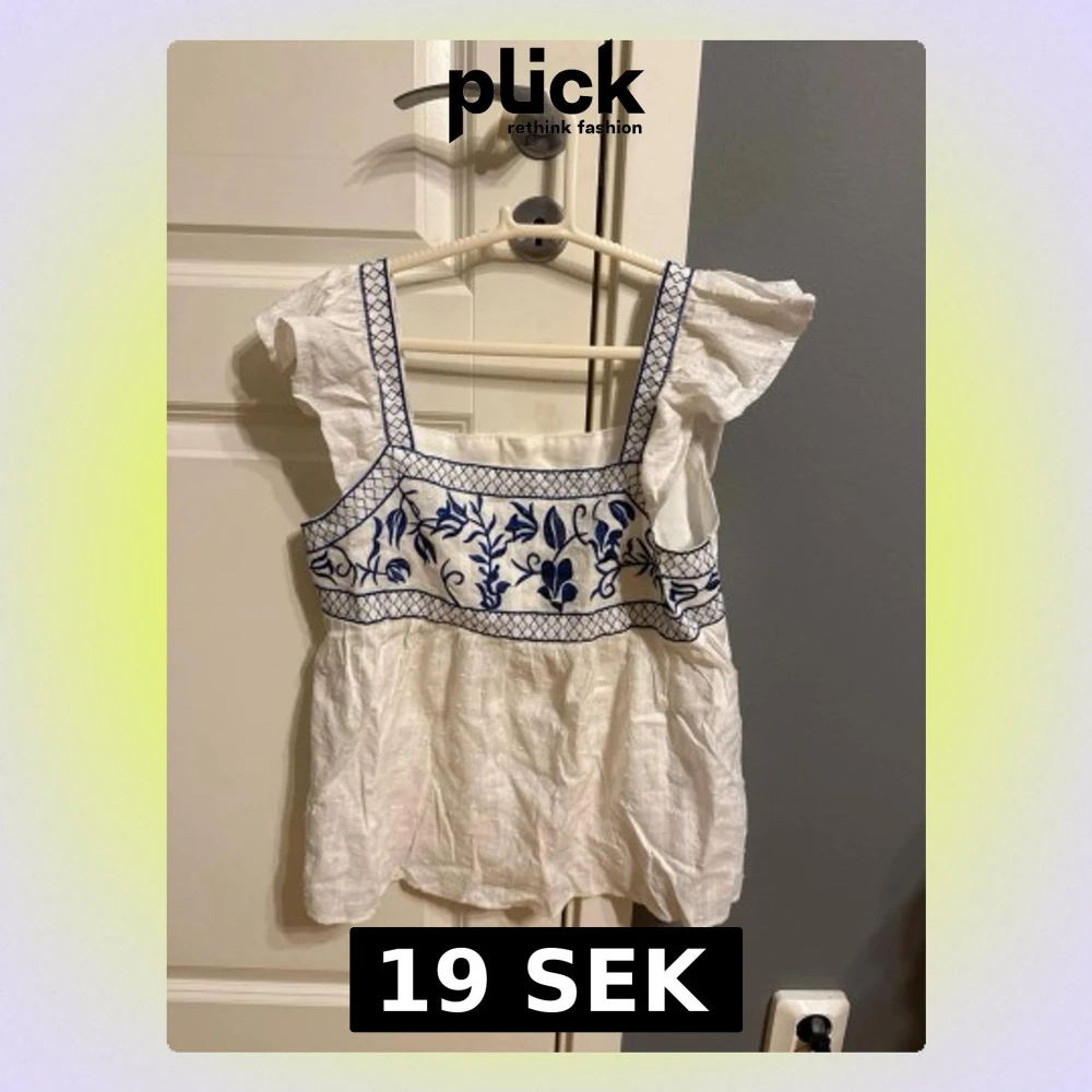 Supersöt vit blus i linne med blått broderat mönster över bysten och axelbanden. Toppen har volangdetaljer vid axlarna och en luftig passform. Använd 3 gånger, storlek S.