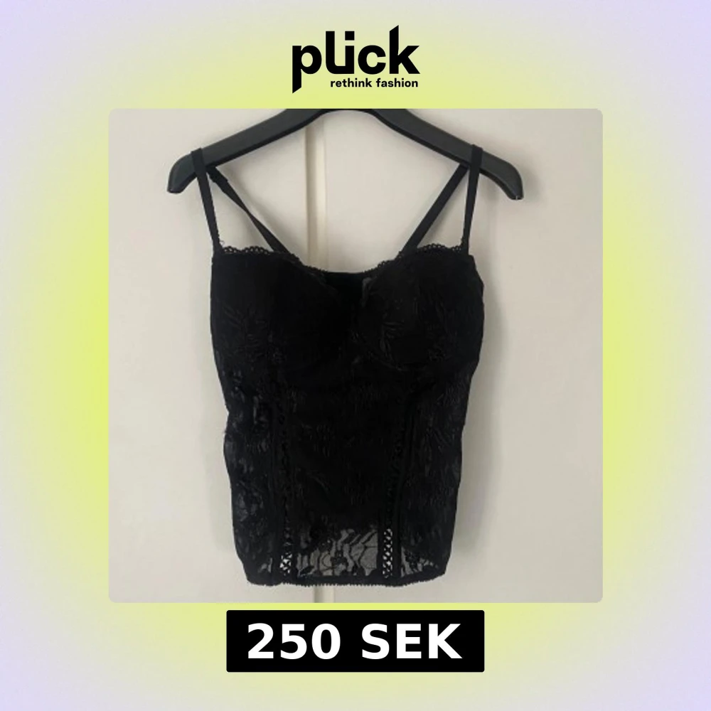 Snygg svart korsett med blommigt spetsmönster och smala axelband. Axelbanden är avtagbara. Storlek D.