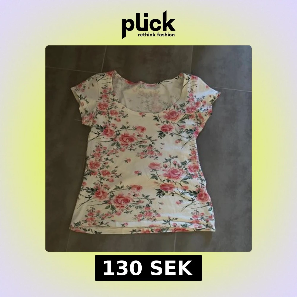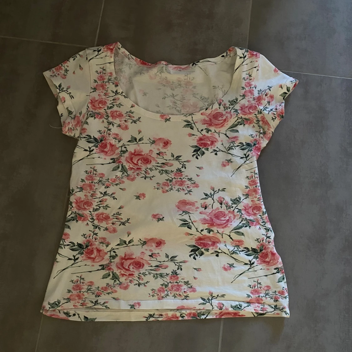 Söt vit topp med rosa blommor och gröna blad. Modellen har rund halsringning och korta ärmar. Vet ej vart den är ifrån eller storlek men tror S
