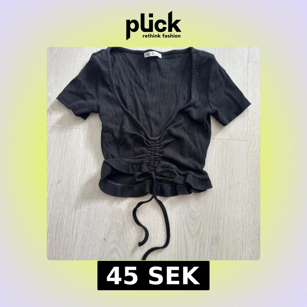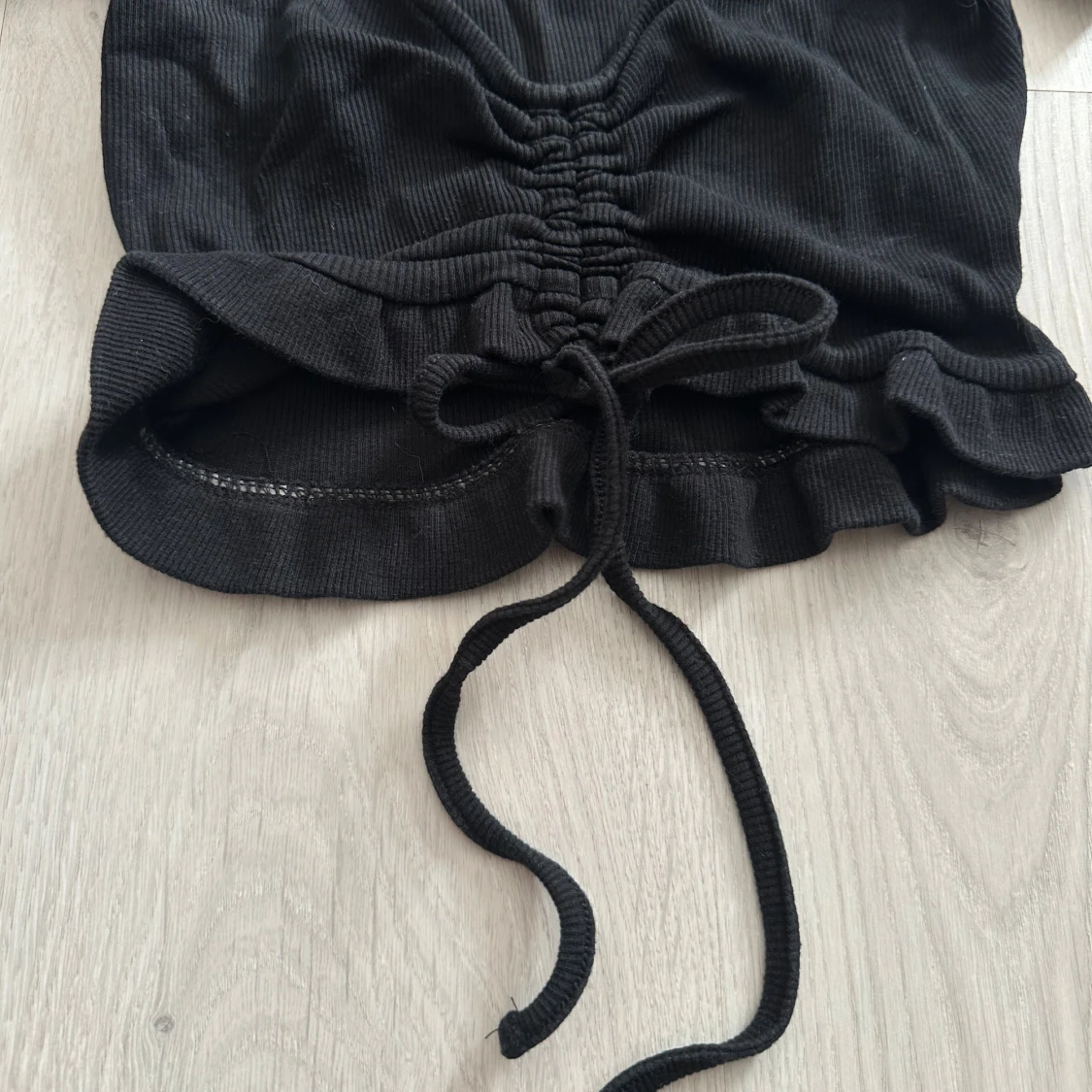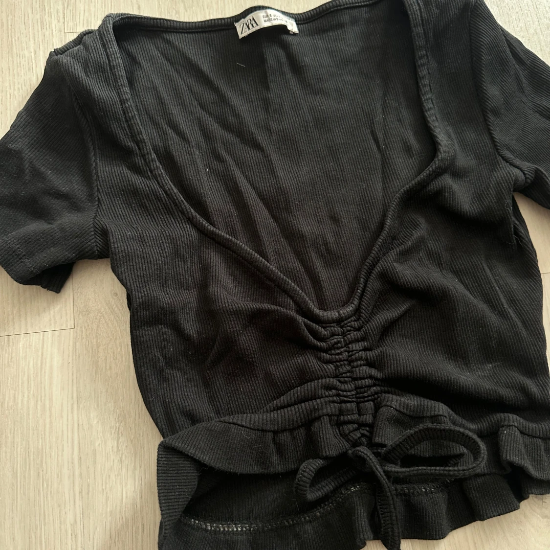 Svart ribbad topp från Zara med korta ärmar, djup v-ringning och snygg snörning framtill som ger en croppad look. Toppen har volangkant nedtill och är i toppskick.