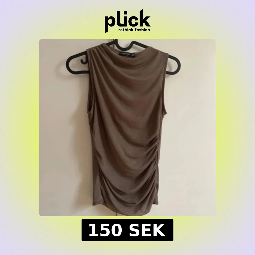 Säljer en brun ärmlös topp från Stradivarius med snygg drapering på sidan. Toppen har en hög hals och är tillverkad i ett mjukt, stretchigt material som sitter tight på kroppen. Funkar som xs/s
