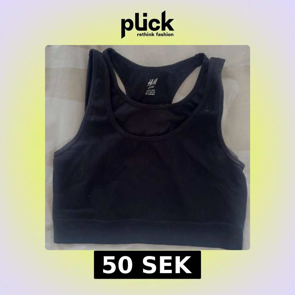 Svart ribbad sport-bh från H&M med brottarrygg. Mjuk och stretchig modell som passar perfekt till träning. Enkel och stilren design utan synliga detaljer eller mönster.