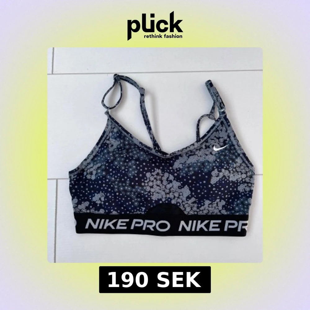 Nike Pro träningstopp med blommigt mönster i mörkblå och grå toner. Topp med smala axelband och elastisk kant med Nike Pro-logga. Tillverkad i Dri-FIT syntetmaterial som andas och håller dig torr under träningen. Perfekt för gym eller sport.