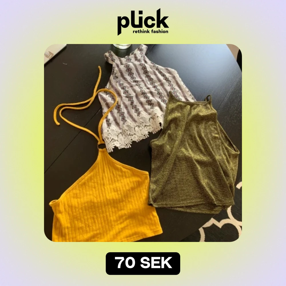 Alla linnen för 70kr, eller var och sig för 30kr styck. Den gula saknar märke och passar S-M, den vita passar xs-s och är från c’est la vie, och den guld-glittriga är M men passar mig med S också och är från Hm. Skriv för mer bilder och frågor💗