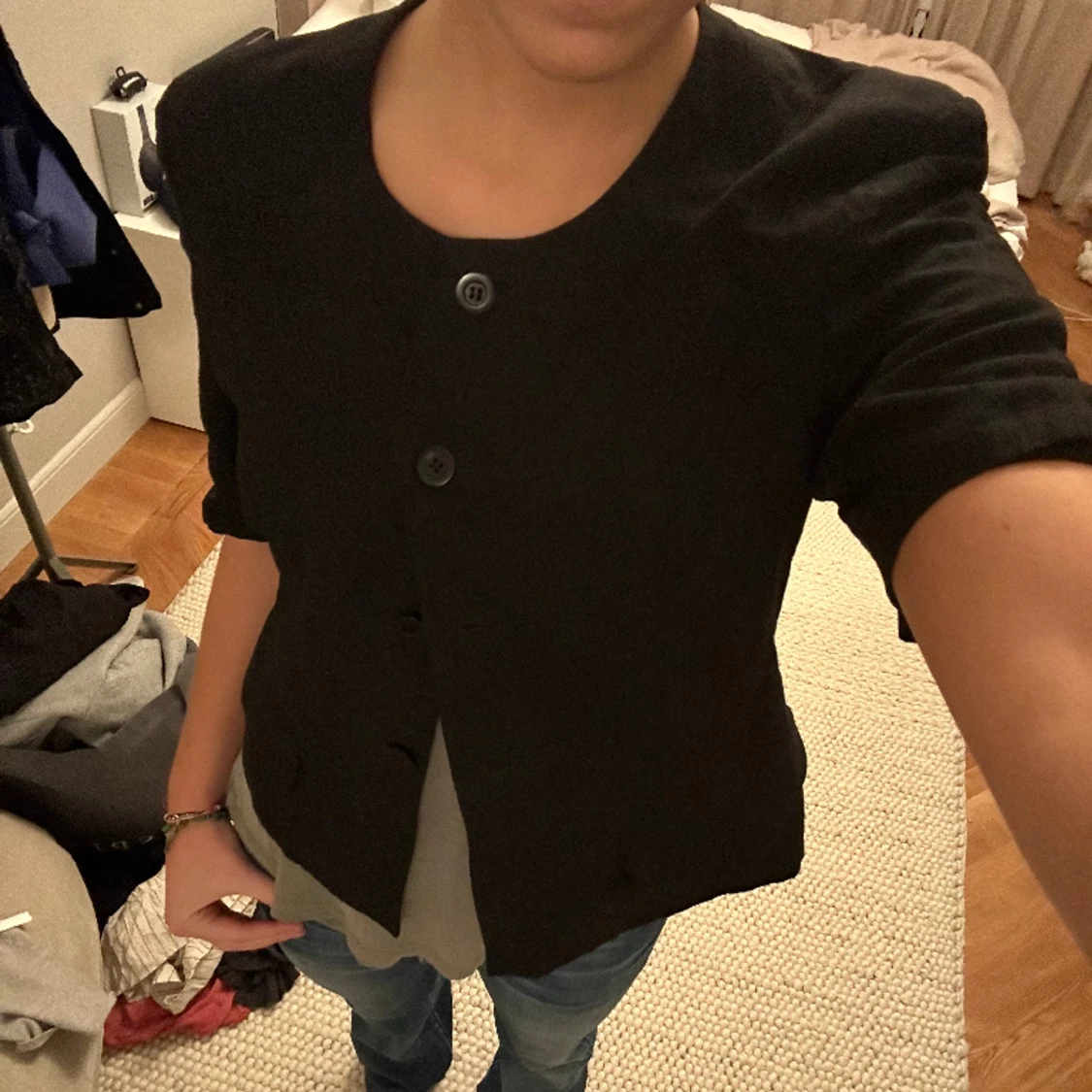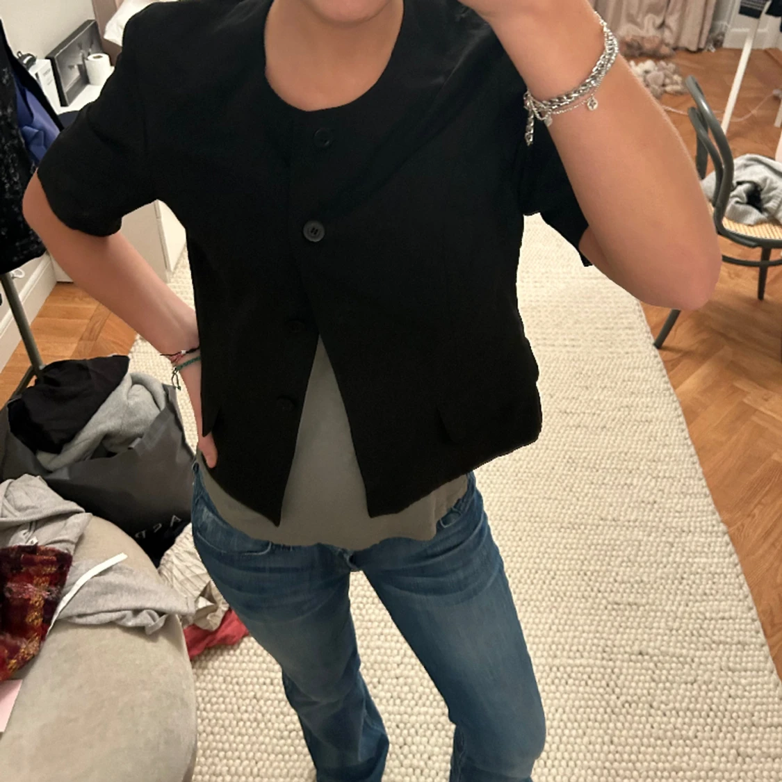 En trekvartsarmad kofta/jacka som man kan ha över kläder, i lite linne/kavaj material